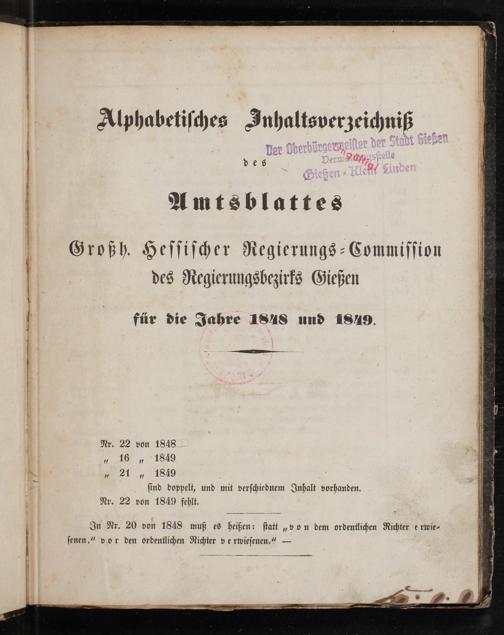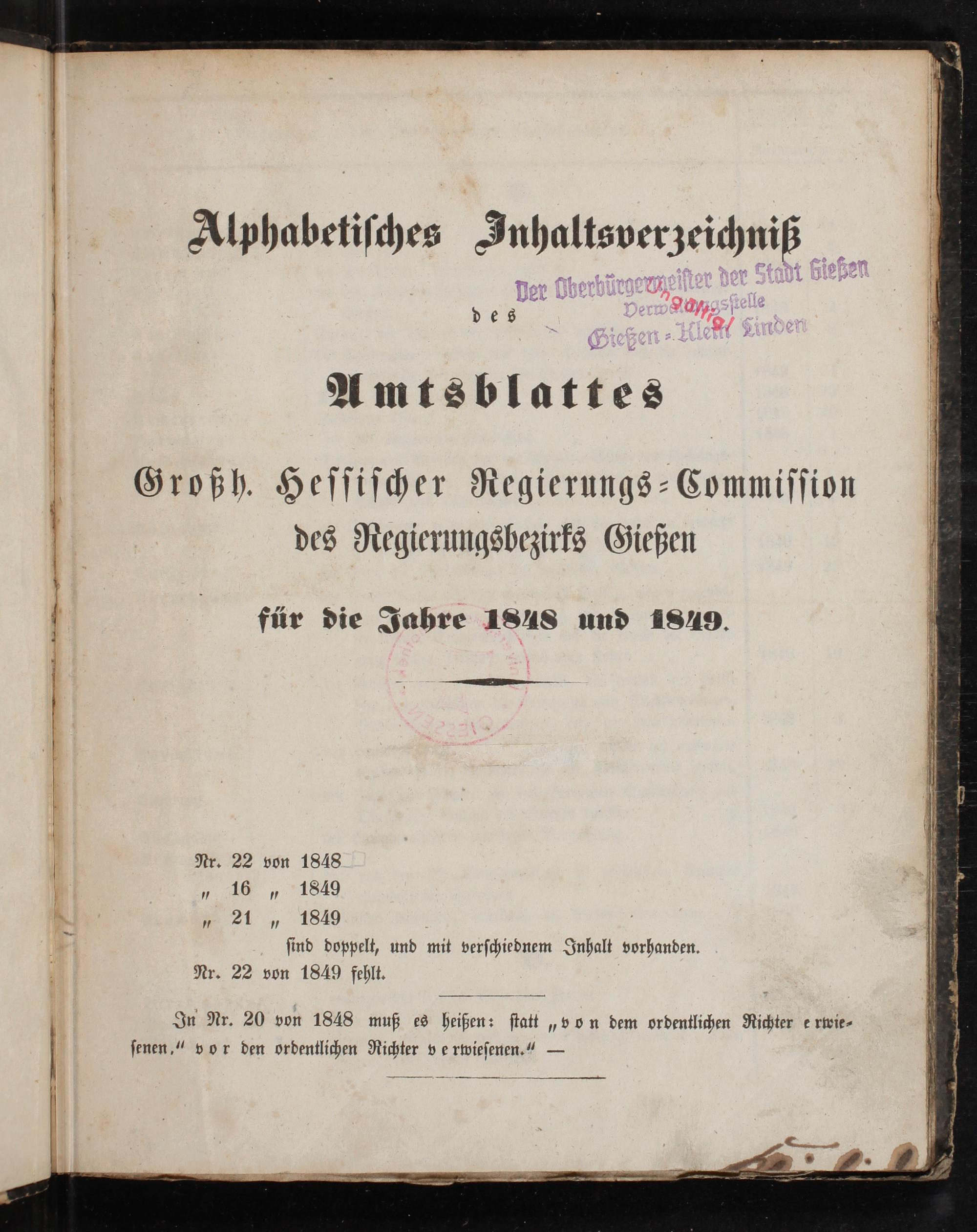 Nr. 22 von 1848 „, 18419 21„ 1849 sind doppelt, und mit verschiednem Inhalt vorhanden. Nr. 22 von 1849 fehlt.