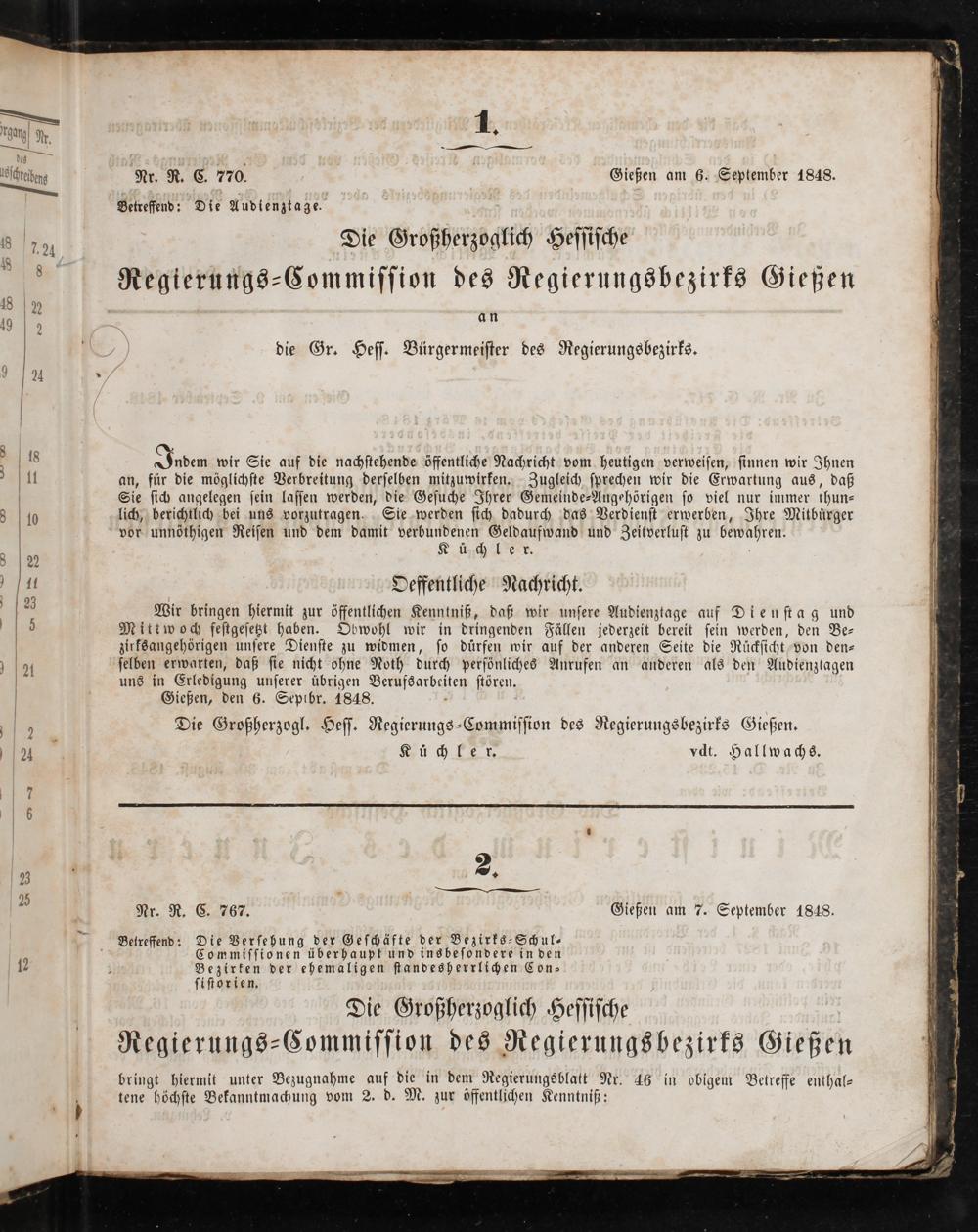 ee Nr. R. C. 770. Gießen am 6. September 1848. Betreffend: Die Audienztage.