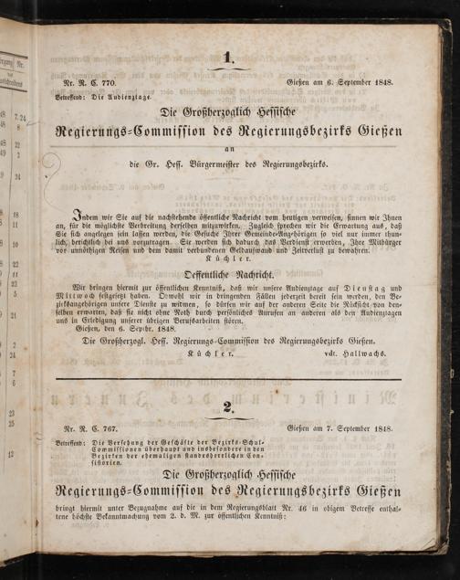 92* 8 19 J B e f ö N 5 5 Indem wir Sie auf die nachstehende öffentliche Nachricht vom heutigen verweisen, sinnen wir Ihnen 11 an, für die möglichste Verbreitung derselben mitzuwirken. Zugleich sprechen wir die Erwartung aus, daß Sie sich angelegen sein lassen werden, die Gesuche Ihrer Gemeinde-Angehörigen so viel nur immer thun— 8 10 lich, berichtlich bei uns vorzutragen. Sie werden sich dadurch das Verdienst erwerben, Ihre Mitbuͤrger vor unnöthigen Reisen und dem damit verbundenen Geldaufwand und Zeitverlust zu bewahren. 9 K ünch elle er. ö 8 22 ö Oeffentliche Nachricht. 4 Wir bringen hiermit zur öffentlichen Kenntniß, daß wir unsere Audienztage auf Dienstag und 4 Mittwoch festgesetzt haben. Obwohl wir in dringenden Fällen jederzeit bereit sein werden, den Be— zirksangehörigen unsere Dienste zu widmen, so dürfen wir auf der anderen Seite die Ruͤcksicht von den— 20 selben erwarten, daß sie nicht ohne Noth durch persönliches Anrufen an anderen als den Audienztagen uns in Erledigung unserer übrigen Berufsarbeiten stören. Gießen, den 6. Septbr. 1848.. 1 Die Großherzogl. Hess. Regierungs-Commission des Regierungsbezirks Gießen. 1 ü ch fn dt. Hallwachs. 1 0 U 2 2. 5 Nr. R. C. 767. Gießen am 7. September 1848.