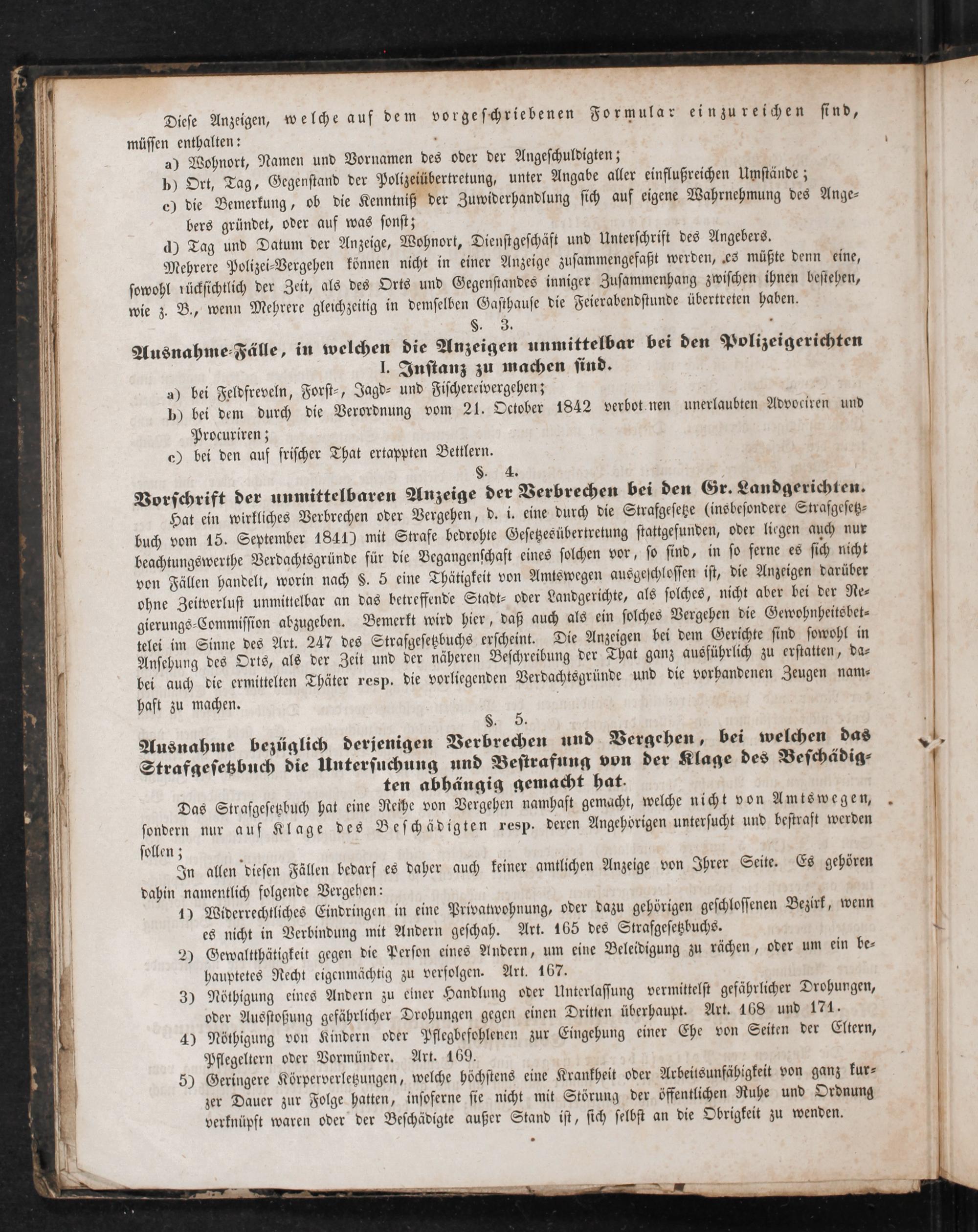 §. 3. 5 Ausnahme⸗Fälle, in welchen die Anzeigen unmittelbar bei den Polizeigerichten J. Instanz zu machen sind. a) bei Feldfreveln, Forst⸗, Jagd- und Fischereivergehen; p) bei dem durch die Verordnung vom 21. October 1842 verbot enen unerlaubten Advociren und Procuriren; c) bei den auf frischer That ertappten Bettlern. §. 4. Vorschrift der unmittelbaren Anzeige der Verbrechen bei den Gr. Landgerichten.