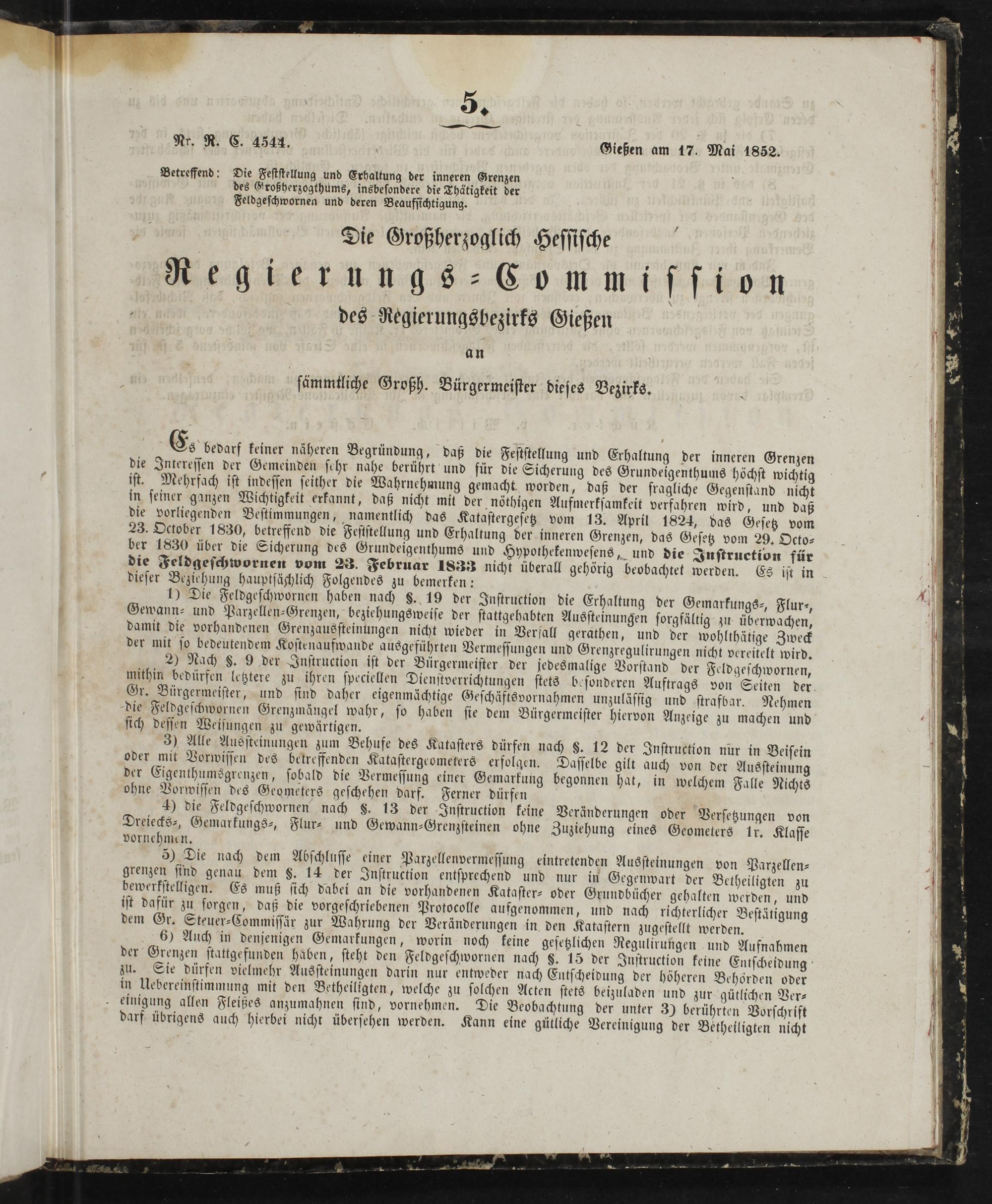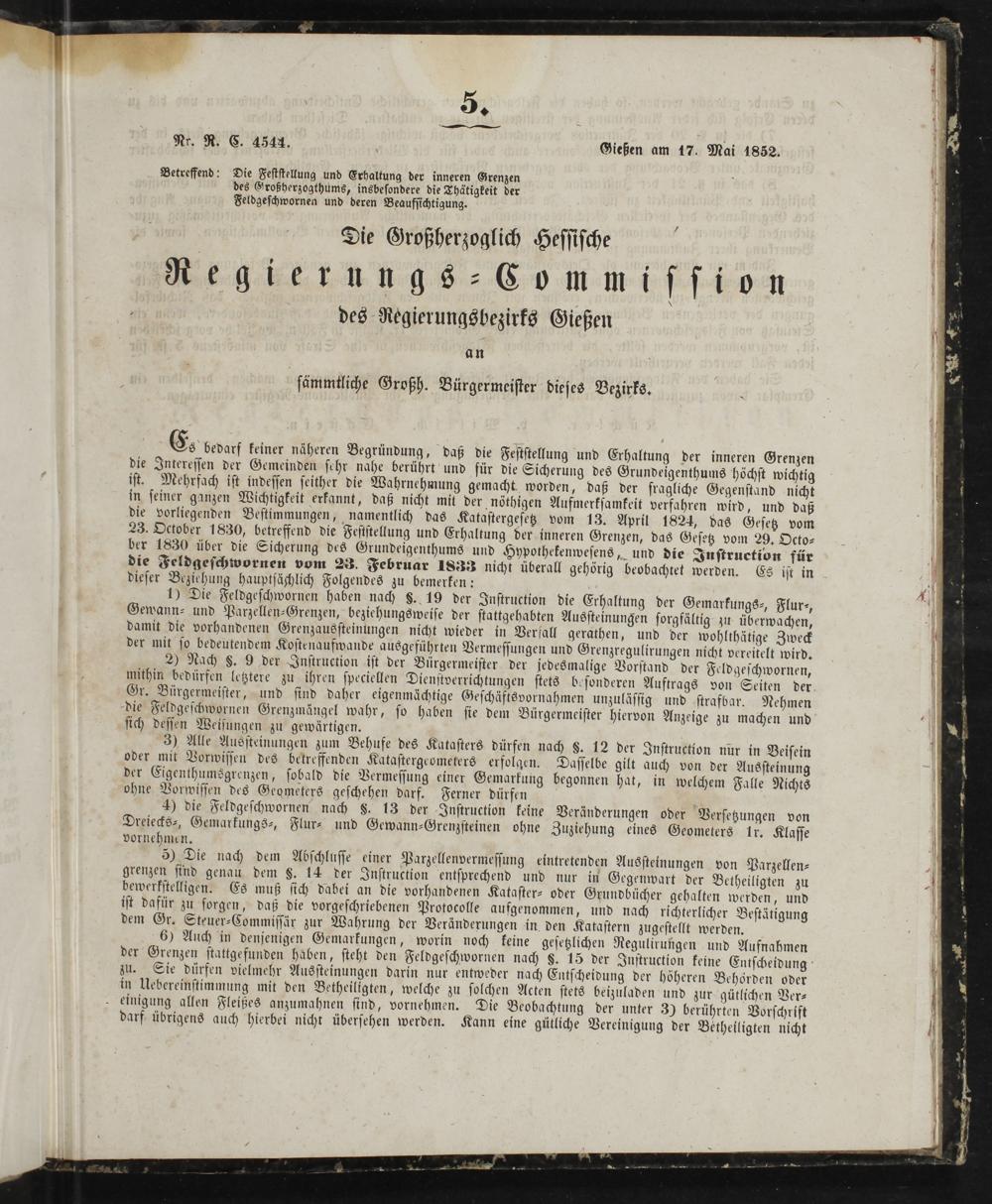 Es bedarf keiner näheren Begründung, daß die Feststellung und Erhaltung der inneren Grenzen die Interessen der Gemeinden sehr nahe berührt und für die Sicherung des Grundeigenthums höchst wichtig ist. Mehrfach ist indessen seither die Wahrnehmung gemacht worden, daß der fragliche Gegenstand nicht in seiner ganzen Wichtigkeit erkannt, daß nicht mit der nöthigen Aufmerksamkeit verfahren wird, und daß die vorliegenden Bestimmungen, namentlich das Katastergesetz vom 13. April 1824, das Gesetz vom 23. October 1830, betreffend die Feststellung und Erhaltung der inneren Grenzen, das Gesetz vom 29. Octo⸗ ber 1830 über die Sicherung des Grundeigenthums und Hypothekenwesens, und die Instruction für die Feldgeschwornen vom 23. Februar 1833 nicht überall gehörig beobachtet werden. Es ist in dieser Beziehung hauptsächlich Folgendes zu bemerken: