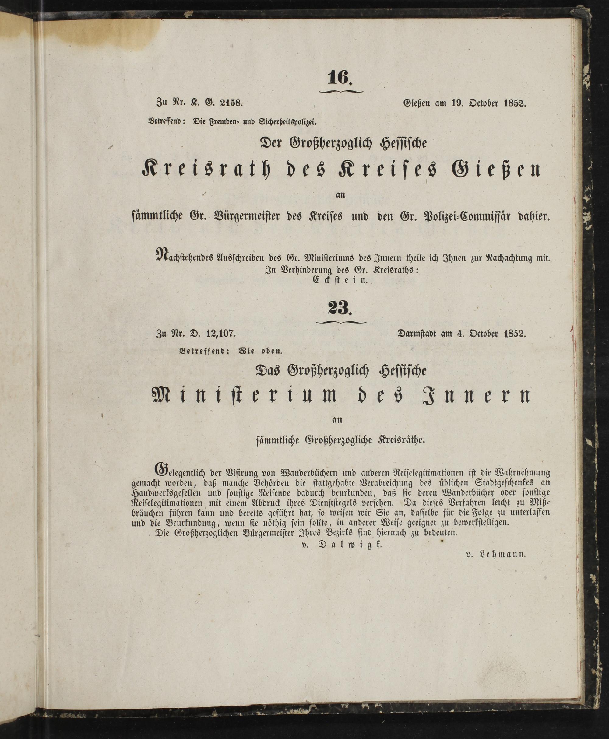 Zu Nr. K. G. 2158. Gießen am 19. October 1852.