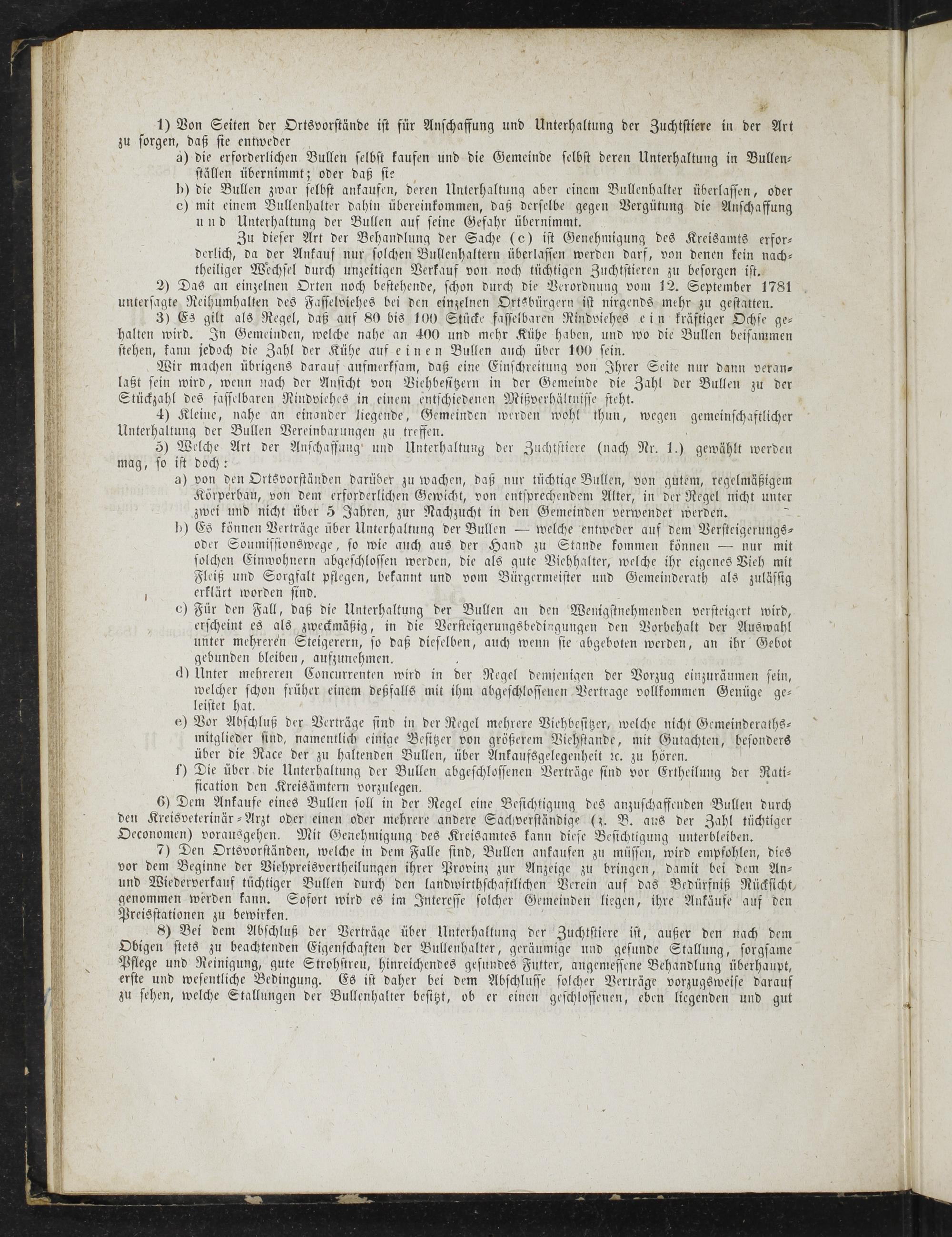 3) Es gilt als Regel, daß auf 80 bis 100 Stücke fasselbaren Rindviehes ein kräftiger Ochse ge— halten wird. In Gemeinden, welche nahe an 400 und mehr Kühe haben, und wo die Bullen beisammen stehen, kann jedoch die Zahl der Kühe auf einen Bullen auch über 100 sein.