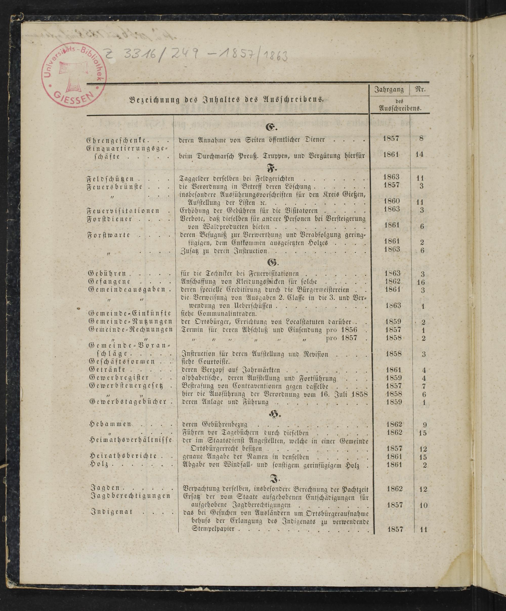 des Ausschreibens. E. Ehrengeschenke. deren Annahme von Seiten öffentlicher Diener 1857 8 Einquartierungsge— 2 schäfte beim Durchmarsch Preuß. Truppen, und Vergütung hierfür 1861 2 ö i ö Feldschützen Taggelder derselben bei Feldgerichten 1863 11 Feuersbrünste die Verordnung in Betreff deren Löschung. 1857 155 15 insbesondere Ausführungsvorschriften für den Kreis bußen, Aufstellung der Listen ꝛc. 5 1860 11 Feuervisitationen Erhöhung der Gebühren für die Visttatoren 1863 8 Forstdiener Verbote, daß dieselben für andere Personen bei Versteigerung 5 von Waldproducten bieten. 1861 6 Forstwarte deren Befugniß zur Verwerthung und Verabfolgung gering fügigen, dem Entkommen ausgesetzten Holzes 1861 2 f Zusatz zu deren Instruction„ 1863 6 G. Gebühren. für die Techniker bei Feuervisitationen 1863 3 Gefangene Anschaffung von Kleidungsstücken für solche 1862 16 Gemeindeausgaben. deren specielle Creditirung durch die Bürgermeistereien 1861 3 5 5 die Verweisung von Ausgaben 2. Classe in die 3. und Ver⸗ wendung von Ueberschüssen. 5 1863 1 Gemeinde-Einkünfte siehe Communalintraden. Gemeinde-Nutzungen der Ortsbürger, Errichtung von Localstatuten darüber. 4859 1 3 Gemeinde-Rechnungen Termin für deren Abschluß und Einsendung pro 1856 1857 1 75 7 7 75 7„„ 7 PTO 1857 1858 2 Gemeinde⸗Voran⸗ schläge.. Fuß eren für deren Aufstellung und Revision 1858 3 e 5 siehe Courtoisie. Getränke deren Verzapf auf Jahrmärkten. 1861 4 Gewerbregister 8 alphabetische, deren Aufstellung und Fortführung 1859 4 Gewerbsteuergesetz. Bestrafung von Contraventionen gegen dasselbe 1857 7 1 5 hier die Ausführung der 1 e vom 16. Juli 1858 1858 6 Gewerbstagebücher. deren Anlage und Führung. 1859 1 H. Hebammen deren Gebührenbezug 1869 5..Fioühren vor Tagebüchern durch dieselben 1862 15 Heimathsverhältnisse der im Staatsdienst Angestellten, welche in einer Gemeinde Ortsbürgerrecht besitzen. 8 1857 12 r 5 genaue Angabe der Namen in densel ben 5 1861 15 Holz 5 Abgabe von Windfall- und sonstigem gerinfügigem Holz 1861 2 J. Jagden. Verpachtung derselben, insbesondere Berechnung der Pachtzeit 1862 12 Jagdberechtigungen Ersatz der vom Staate aufgehobenen Entschädigungen für * aufgehobene Jagdberechtigungen 5 1857 10 Indigenat das bei Gesuchen von Ausländern um Ortsbürgeraufnahme behufs der e des Indigenats zu verwendende Stempelpapier. 1 1857 11