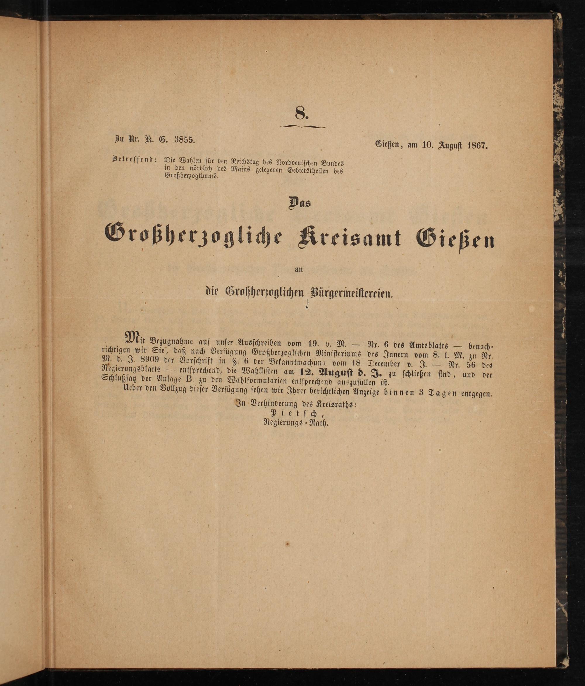 Zu Ur. R. G. 3855. Gießsen, am 10. August 1867.