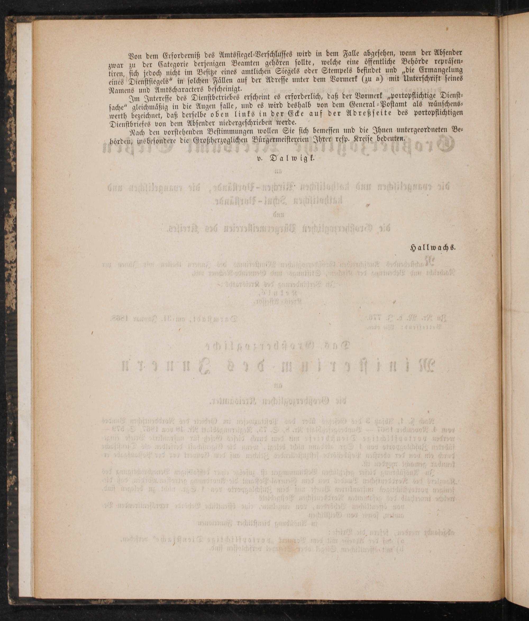 Nach den vorstehenden Bestimmungen wollen Sie sich bemessen und die Ihnen untergeordneten Be— hörden, insbesondere die Großherzoglichen Bürgermeistereien Ihrer resp. Kreise bedeuten.