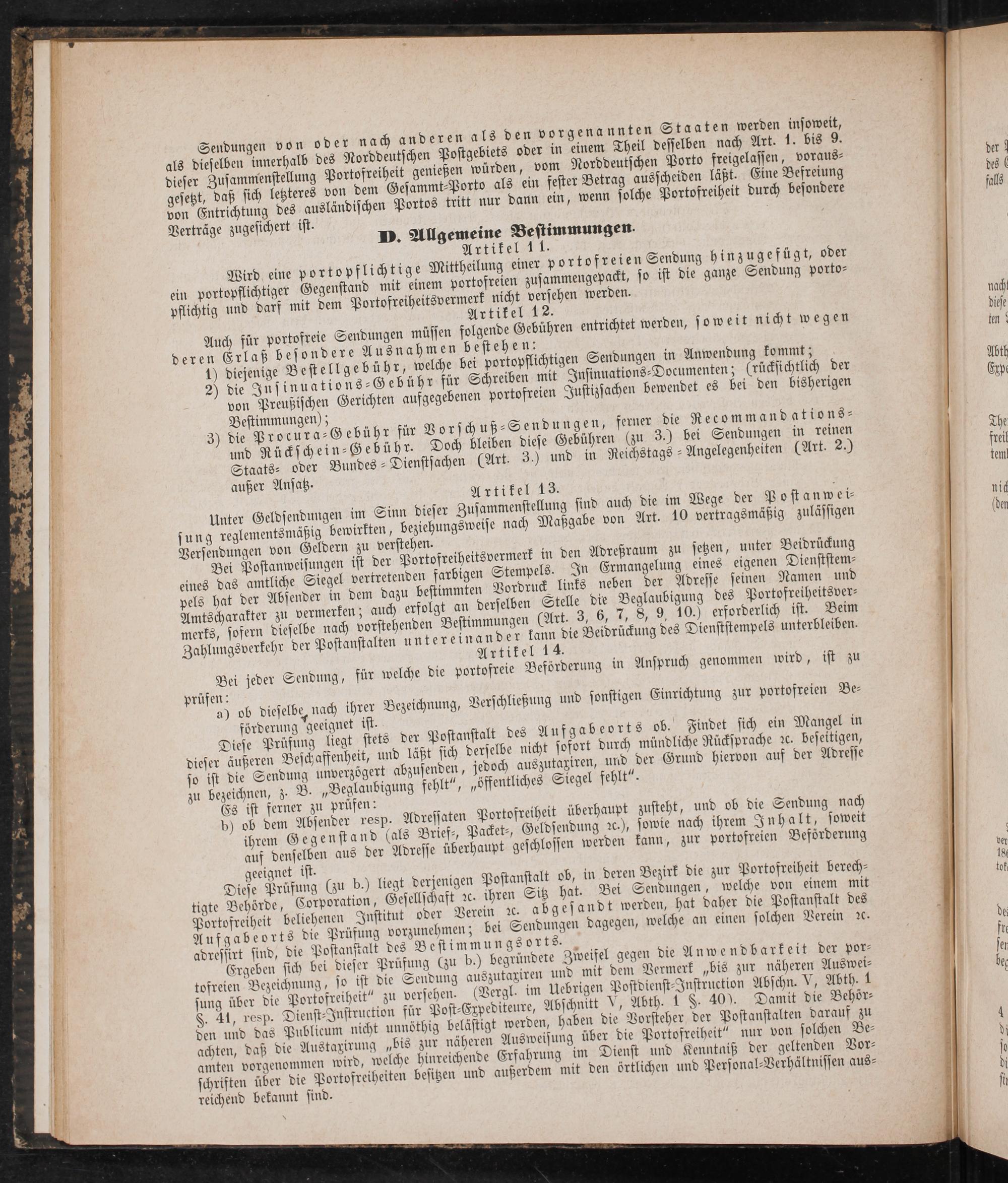Sendungen von oder nach anderen als den vorgenannten Staaten werden insoweit, als dieselben innerhalb des Norddeutschen Postgebiets oder in einem Theil desselben nach Art. 1. bis 9. dieser Zusammenstellung Portofreiheit genießen würden, vom Norddeutschen Porto freigelassen, voraus⸗ gesetzt, daß sich letzteres von dem Gesammt⸗Porto als ein fester Betrag ausscheiden läßt. Eine Befreiung von Entrichtung des ausländischen Portos tritt nur dann ein, wenn solche Portofreiheit durch besondere Verträge zugesichert ist. D. Allgemeine Bestimmungen. Artikel 11.