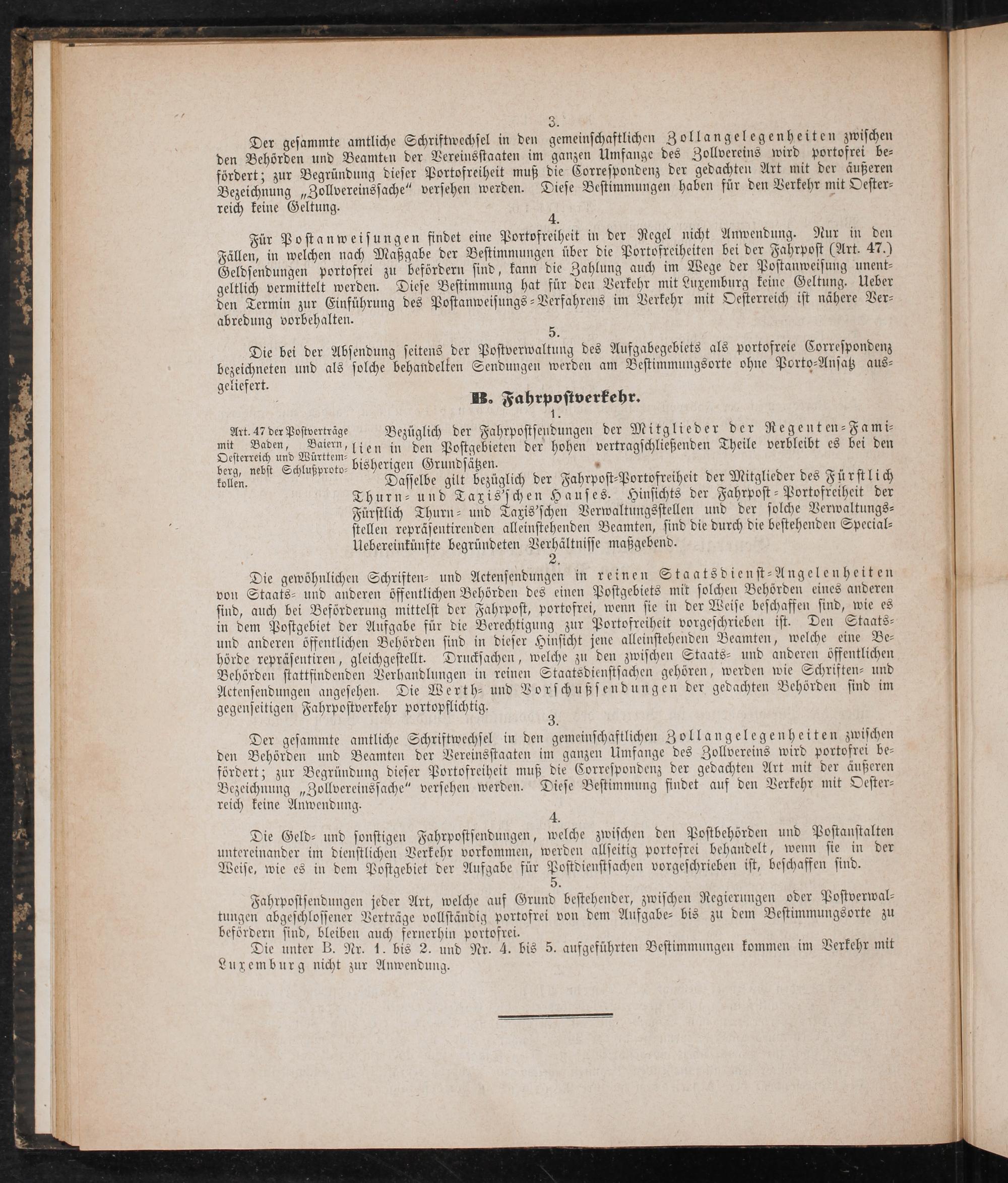3. Der gesammte amtliche Schriftwechsel in den gemeinschaftlichen Zollangelegenheiten zwischen den Behörden und Beamten der Vereinsstaaten im ganzen Umfange des Zollvereins wird portofrei be— fördert; zur Begründung dieser Portofreiheit muß die Correspondenz der gedachten Art mit der äußeren Bezeichnung„Zollvereinssache“ versehen werden. Diese Bestimmungen haben für den Verkehr mit Oester— reich keine Geltung. 4.