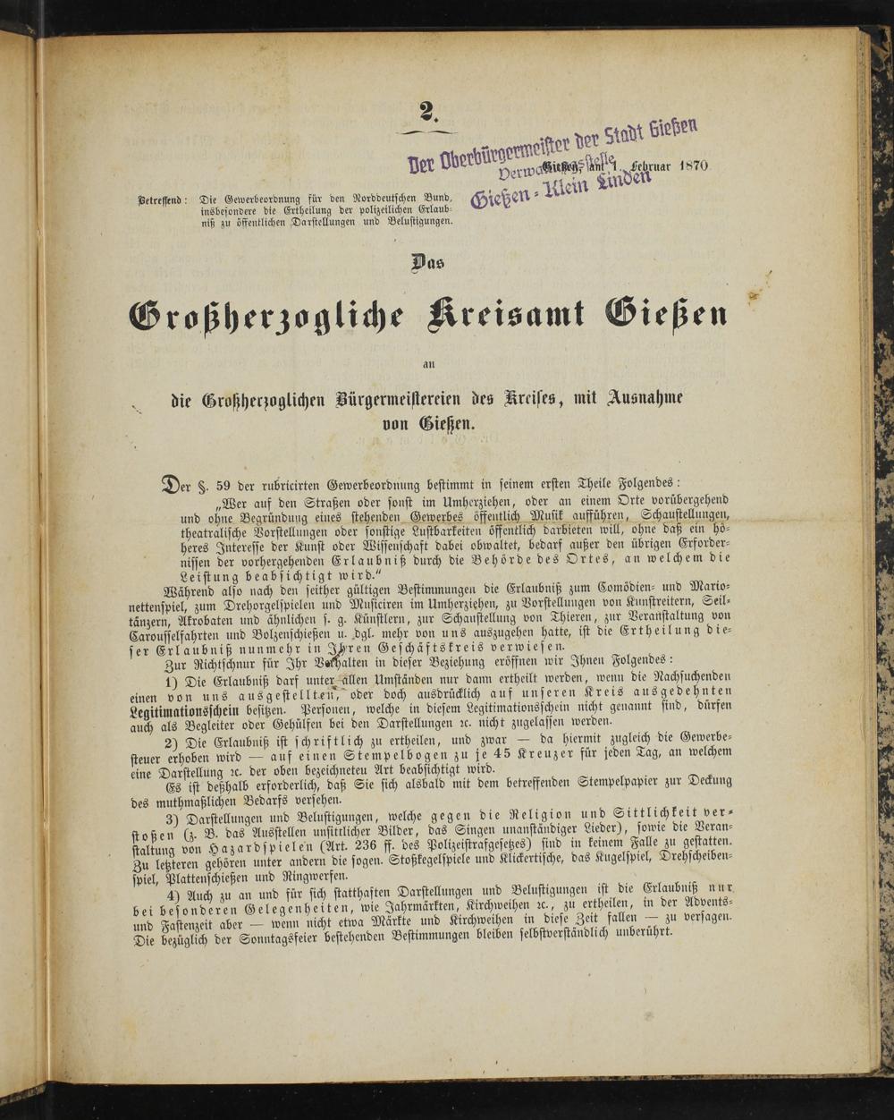 ver Oberbürgerme eg falle N Verwende Net 1870 5 4* Vetressend: Die Gewerbeordnung für den Norddeutschen Bund, Gießen ⸗Mlein 0 1 insbesondere die Erkheilung der polizeilichen Erlaub⸗ 100 1 niß zu öffentlichen Darstellungen und Belustigungen. 1 1