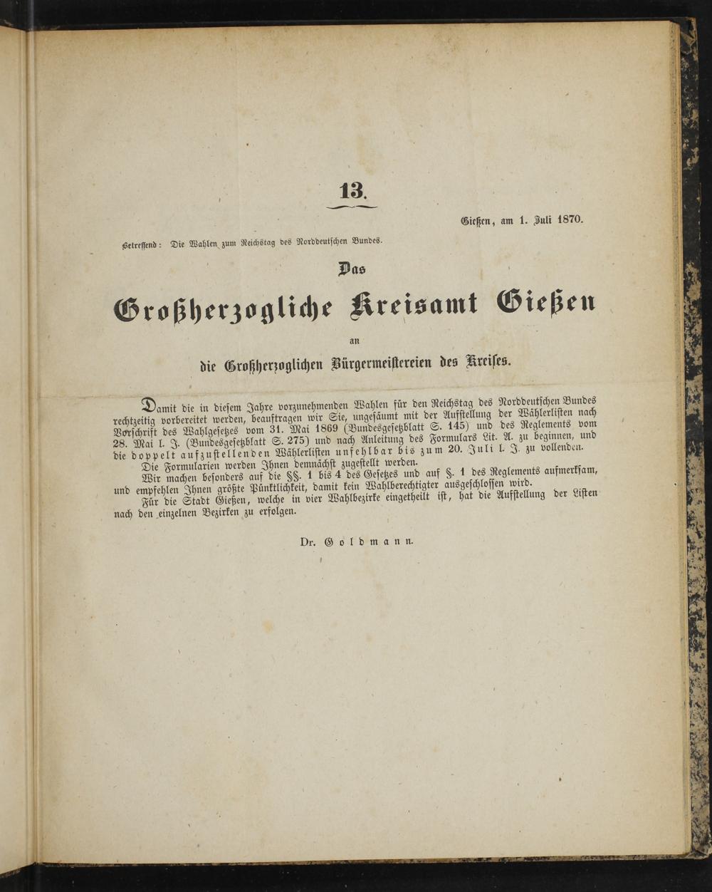 Damit die in diesem Jahre vorzunehmenden Wahlen für den Reichstag des Norddeutschen Bundes rechtzeitig vorbereitet werden, beauftragen wir Sie, ungesäumt mit der Aufstellung der Wählerlisten nach Vorschrift des Wahlgesetzes vom 31. Mai 1869(Bundesgesetzblatt S. 145) und des Reglements vom 28. Mai l. J.(Bundesgesetzblatt S. 275) und nach Anleitung des Formulars Lit. A. zu beginnen, und die doppelt aufzustellenden Wählerlisten unfehlbar bis zum 20. Julie.. J. zu vollenden.
