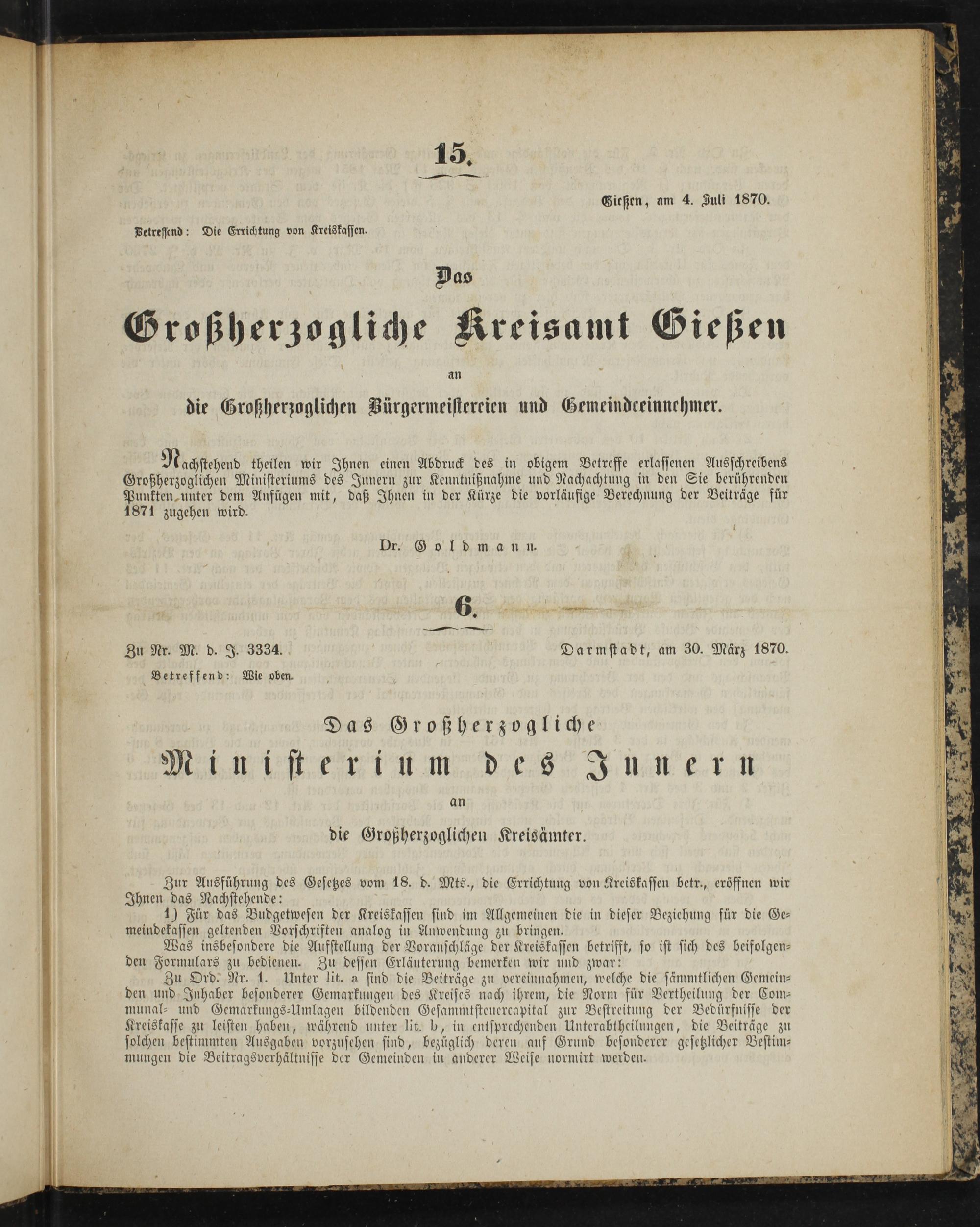 Nachstehend theilen wir Ihnen einen Abdruck des in obigem Betreffe erlassenen Ausschreibens Großherzoglichen Ministeriums des Junern zur Kenntnißnahme und Nachachtung in den Sie berührenden Punkten unter dem Anfügen mit, daß Ihnen in der Kürze die vorläufige Berechnung der Beiträge für 1871 zugehen wird.