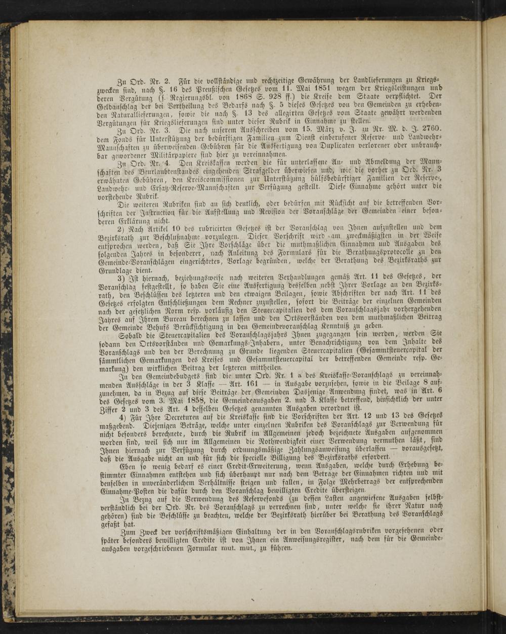 4) Für Ihre Decreturen auf die Kreiskasse sind die Vorschriften der Art. 12 und 13 des Gesetzes maßgebend. Diejenigen Beträge, welche unter einzelnen Rubriken des Voranschlags zur Verwendung für nicht besonders berechnete, durch die Rubrik im Allgemeinen jedoch bezeichnete Ausgaben aufgenommen worden sind, weil sich nur im Allgemeinen die Nothwendigkeit einer Verwendung vermuthen läßt, sind Ihnen hiernach zur Verfügung durch ordnungsmäßige Zahlungsanweisung überlassen— vorausgesetzt, daß die Ausgabe nicht an und für sich die specielle Billigung des Bezirksraths erfordert.