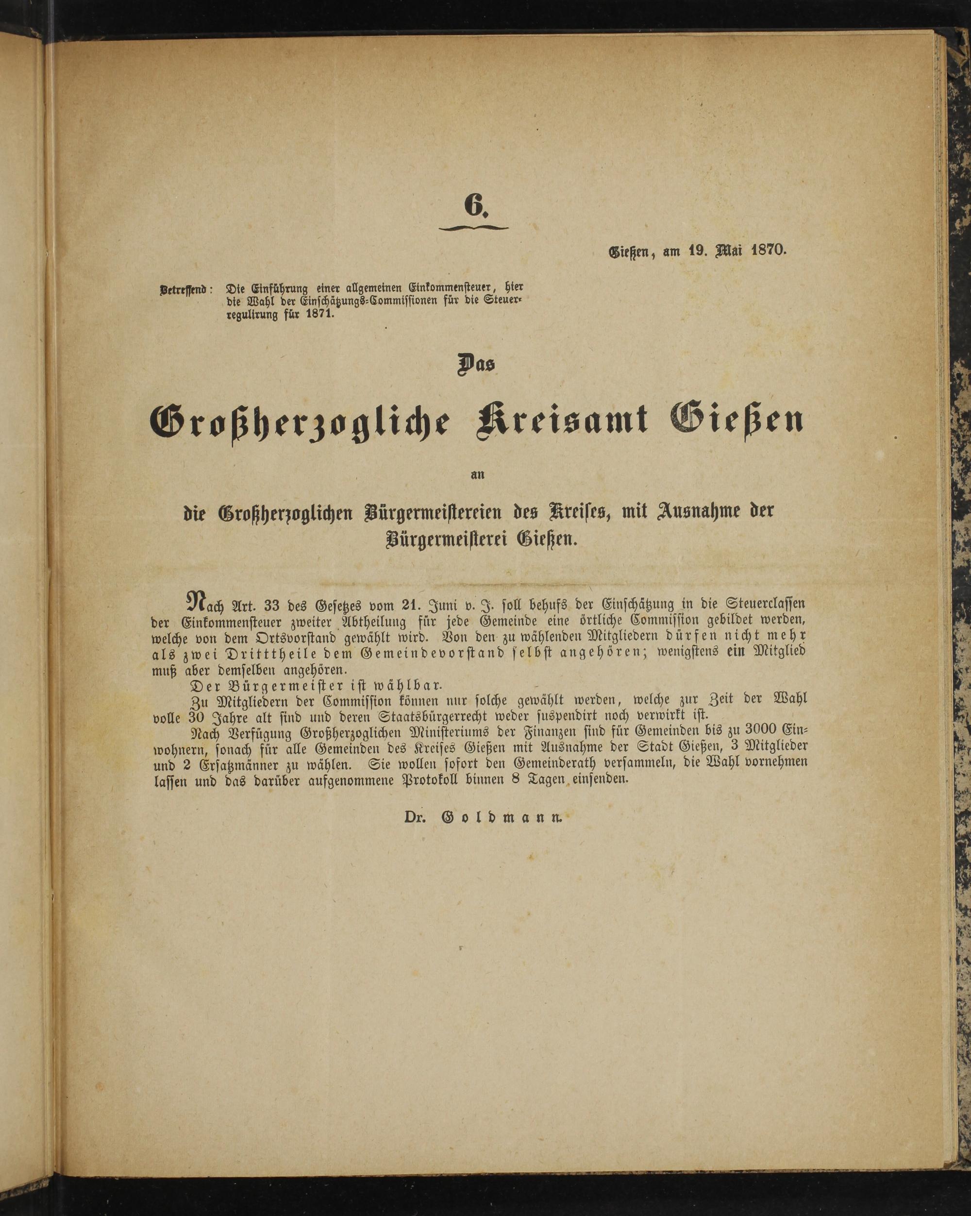Nach Verfügung Großherzoglichen Ministeriums der Finanzen sind für Gemeinden bis zu 3000 Ein⸗ wohnern, sonach für alle Gemeinden des Kreises Gießen mit Ausnahme der Stadt Gießen, 3 Mitglieder und 2 Ersatzmänner zu wählen. Sie wollen sofort den Gemeinderath versammeln, die Wahl vornehmen lassen und das darüber aufgenommene Protokoll binnen 8 Tagen einsenden.