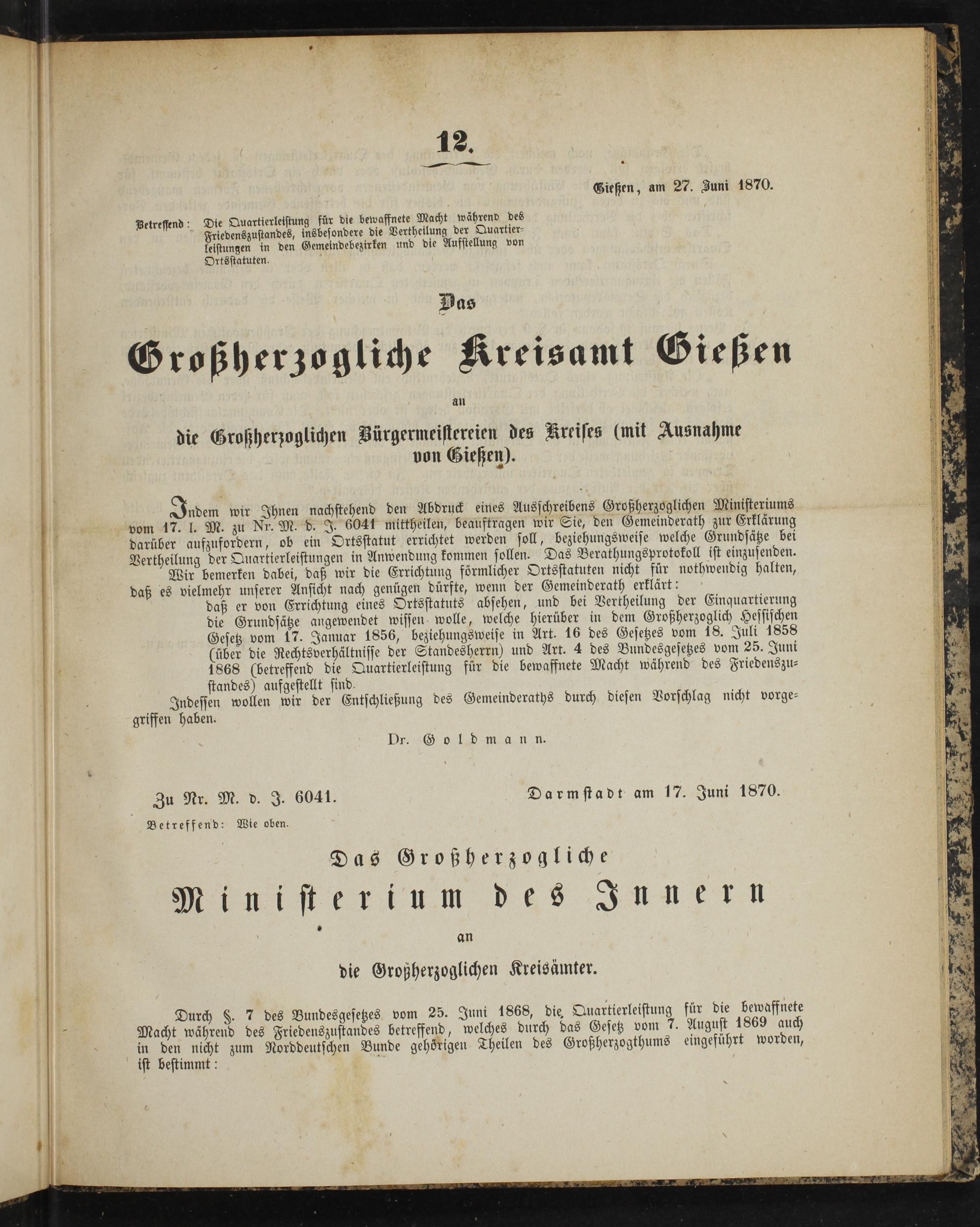 Zu Nr. M. d. J. 6041. Darmstadt am 17. Juni 1870. Betreffend: Wie oben.