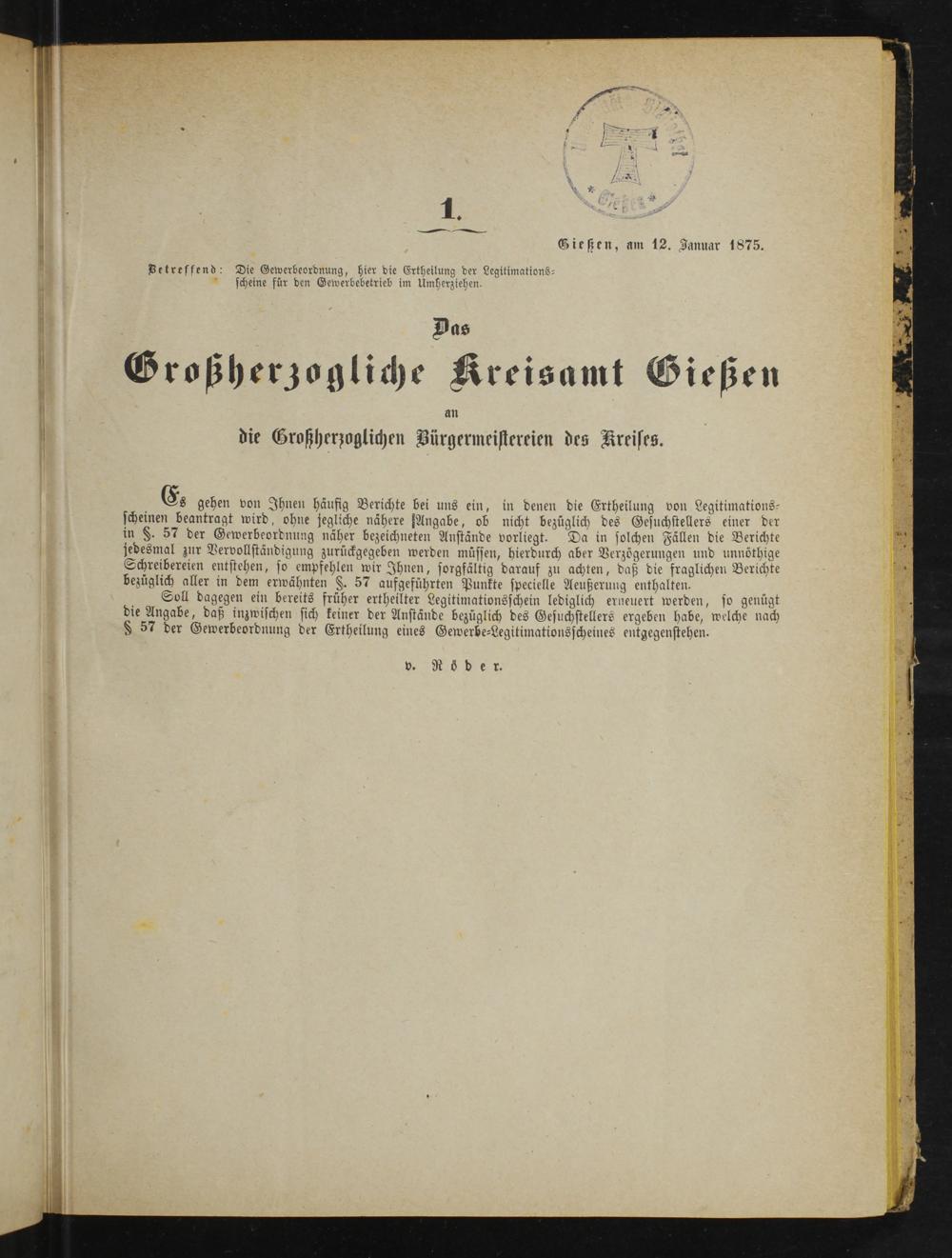 Betreffend: Die Gewerbeordnung, hier die Ertheilung der Legitimations— scheine für den Gewerbebetrieb im Umherziehen.
