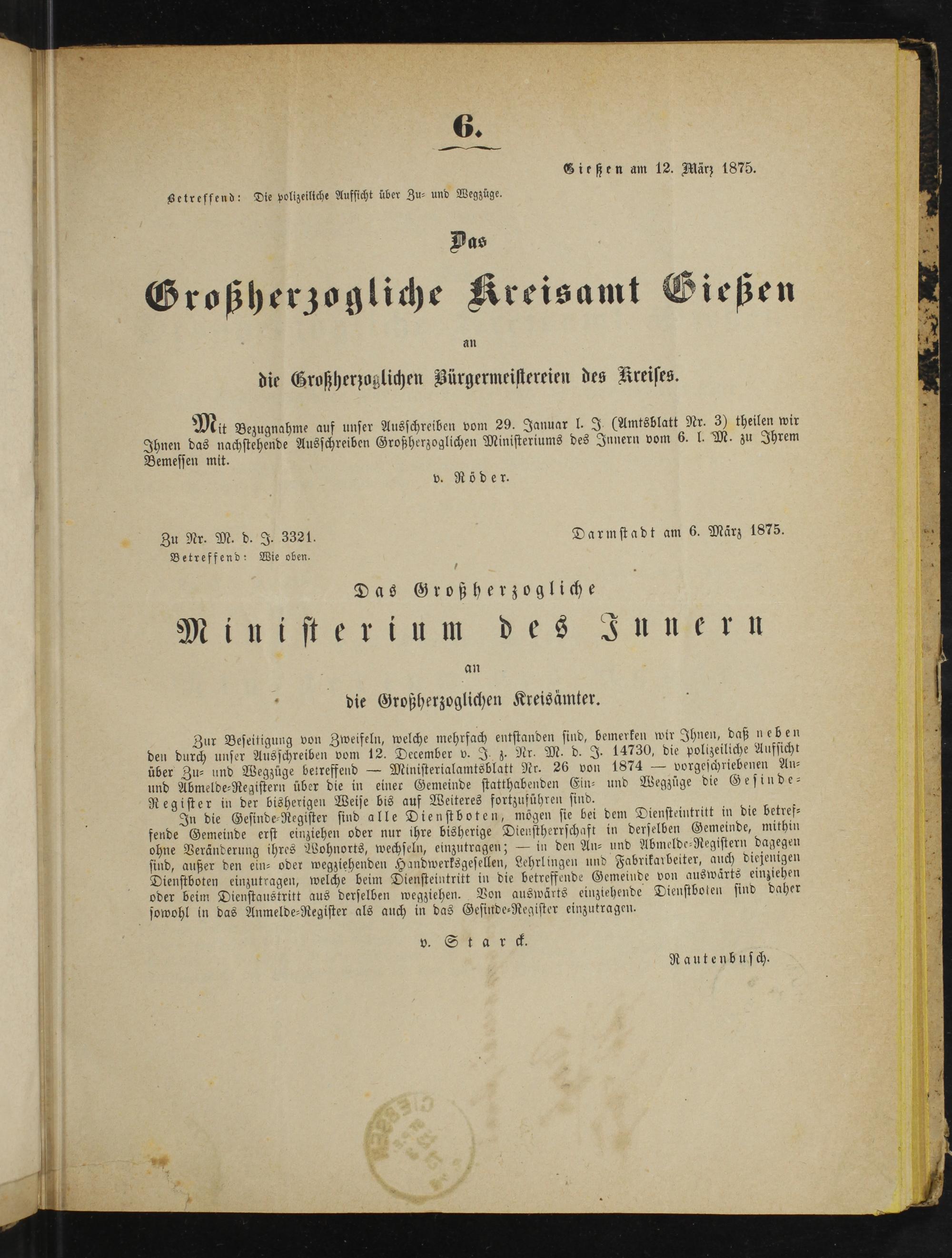 Gießen am 12. März 1875. getreffend: Die polizeiliche Aufsicht über Zu- und Wegzüge.