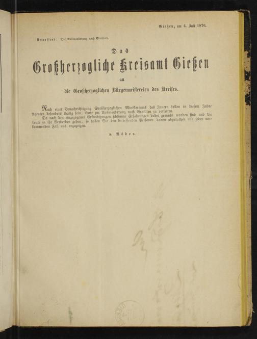 * Nach einer Benachrichtigung Großherzoglichen Ministeriums des Innern sollen in diesem Jahre Agenten besonders thätig sein, Leute zur Auswanderung nach Brasilien zu verleiten. Da nach den eingezogenen Erkundigungen schlimme Erfahrungen dabei gemacht worden sind und die Leute in ihr Verderben gehen, so haben Sie den betreffenden Personen davon abzurathen und jeden vor⸗