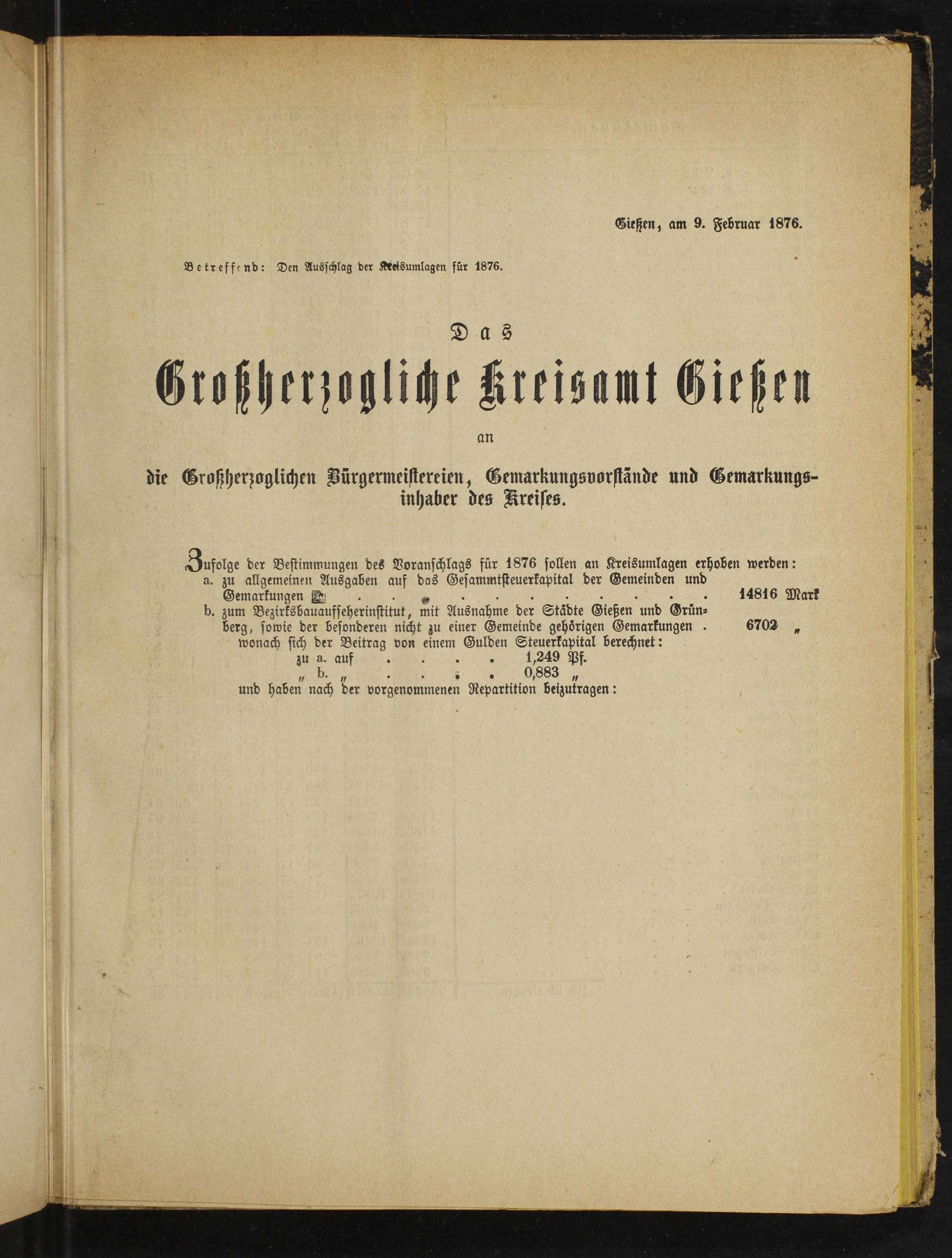 Betreffend: Den Ausschlag der Kreisumlagen für 1876.