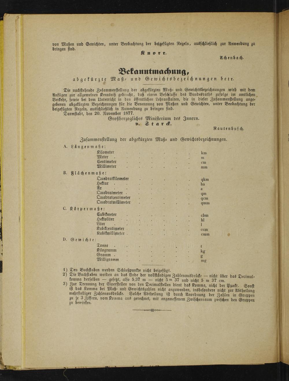 erkehr, sowie bei dem Unterricht in den öffentlichen Lehranstalten, die in dieser Zusammenstellung ange⸗ 12 75 abgeldnzten S5 für die Benennung von Maßen und Gewichten, unter Beobachtung der beigefügten Regeln, ausschließlich in Anwendung zu bringen sind. Darmstadt, den 20. November 1877. Großberzogliches Ministerium des Innern. v Starck. Rautenbusch.