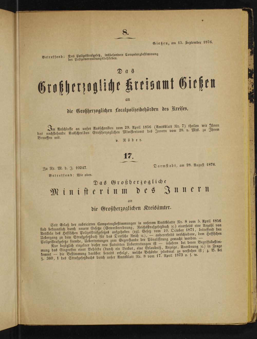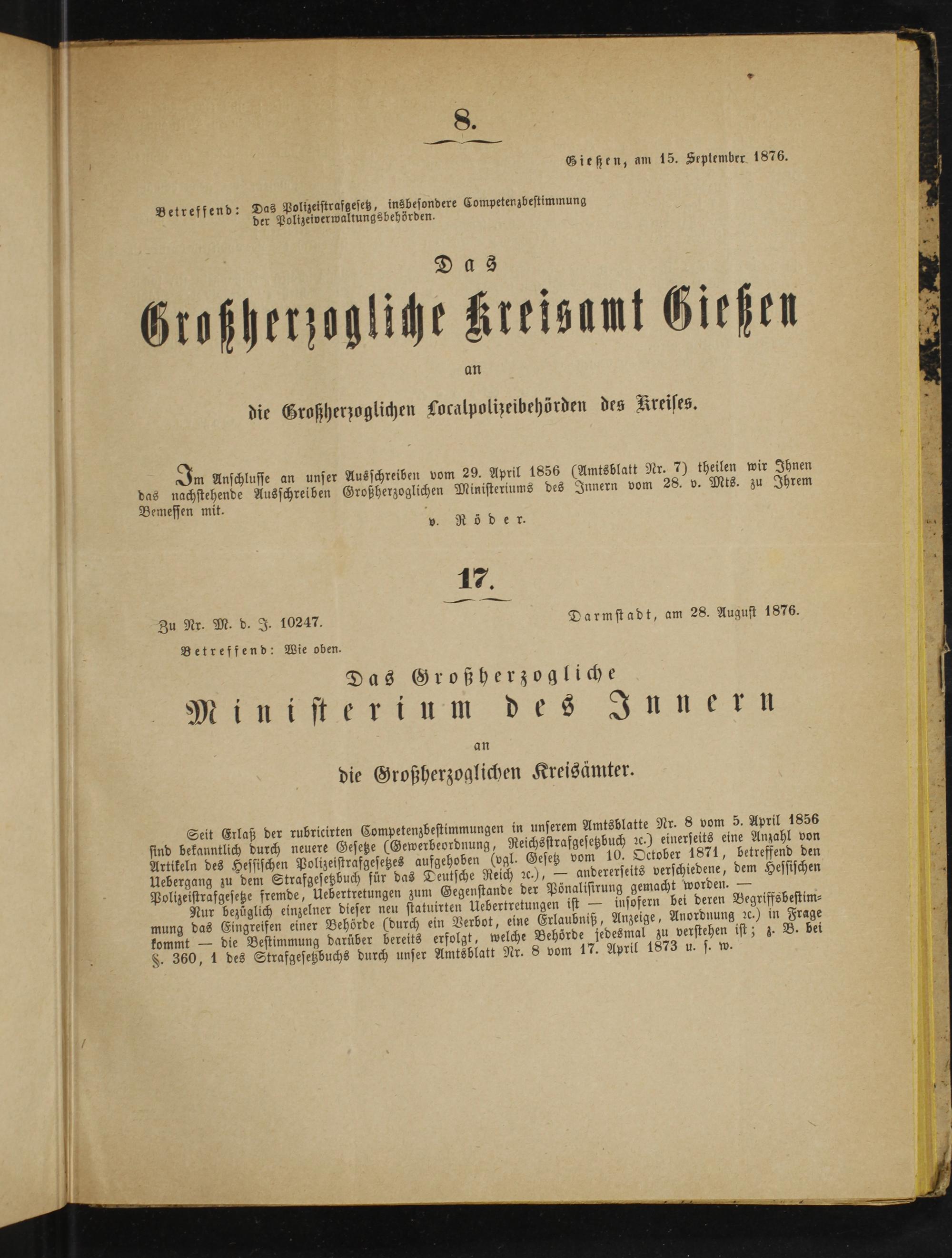 Zu Nr. M. d. J. 10247. Darmstadt, am 28. August 1876. Betreffend: Wie oben. Das Großherzogliche aum des Innen