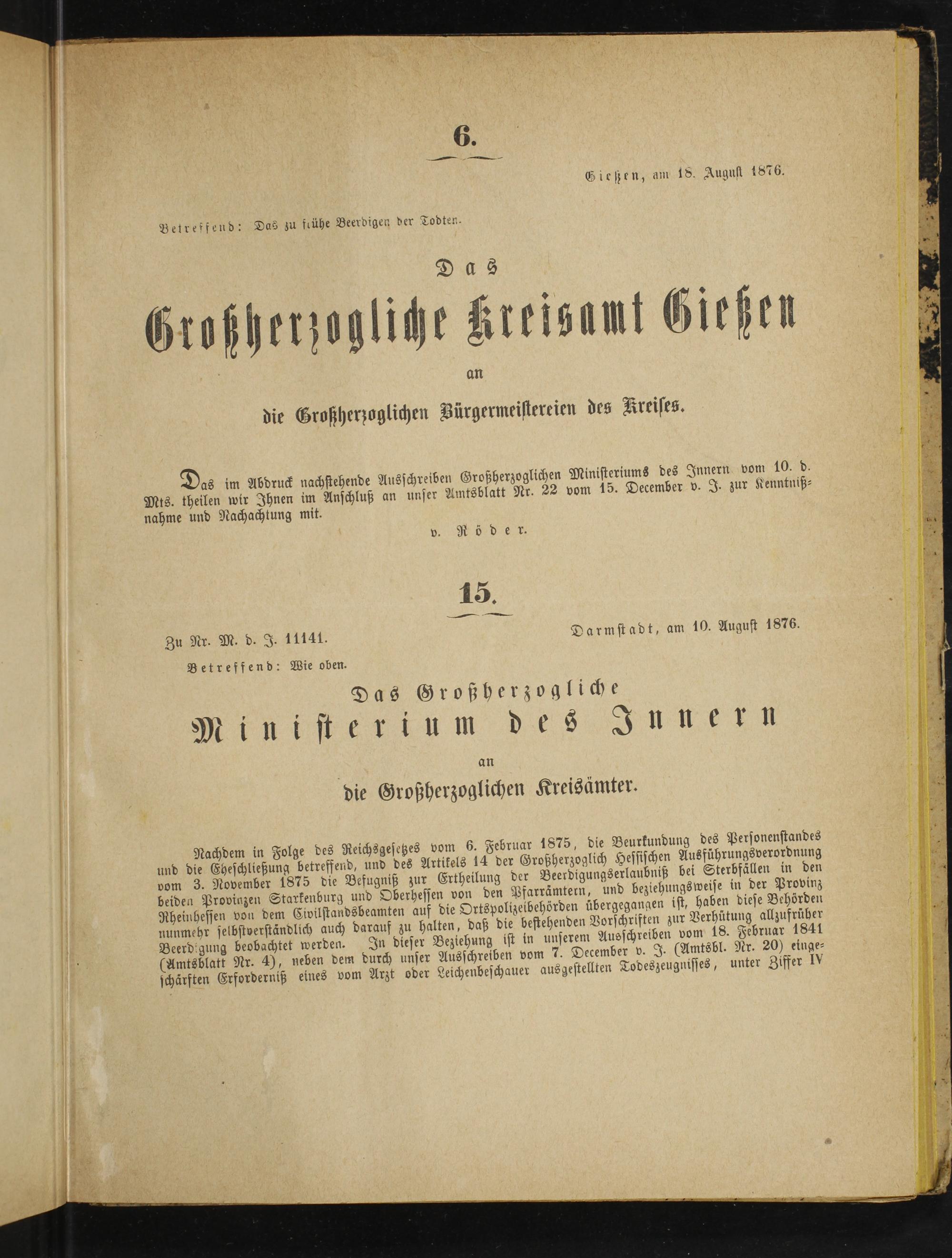 Nachdem in Folge des Reichsgesetzes vom 6. Februar 1875, die Beurkundung des Personenstandes und die Cheschließung betreffend, und des Artikels 14 der Großherzoglich Hessischen Ausführungsverordnung vom 3. November 1875 die Befugniß zur Ertheilung der Beerdigungserlaubniß bei Sterbfällen in den beiden Proviazen Starkenburg und Oberhessen von den Pfarrämtern, und beziehungsweise in der Provinz Rheinhessen von dem Civilstandsbeamten auf die Ortspolizeibehörden übergegangen ist, haben diese Behörden nunmehr selbstverständlich auch darauf zu halten, daß die bestehenden Vorschriften zur Verhütung allzufrüher Beerd'gung beobachtet werden. In dieser Beziehung ist in unserem Ausschreiben vom 18. Februar 1841 (Amtsblatt Nr. 4), neben dem durch unser Ausschreiben vom 7. December v. J.(Amtsbl. Nr. 20) einge⸗ schärften Erforderniß eines vom Arzt oder Leichenbeschauer ausgestellten Todeszeugnisses, unter Ziffer IV