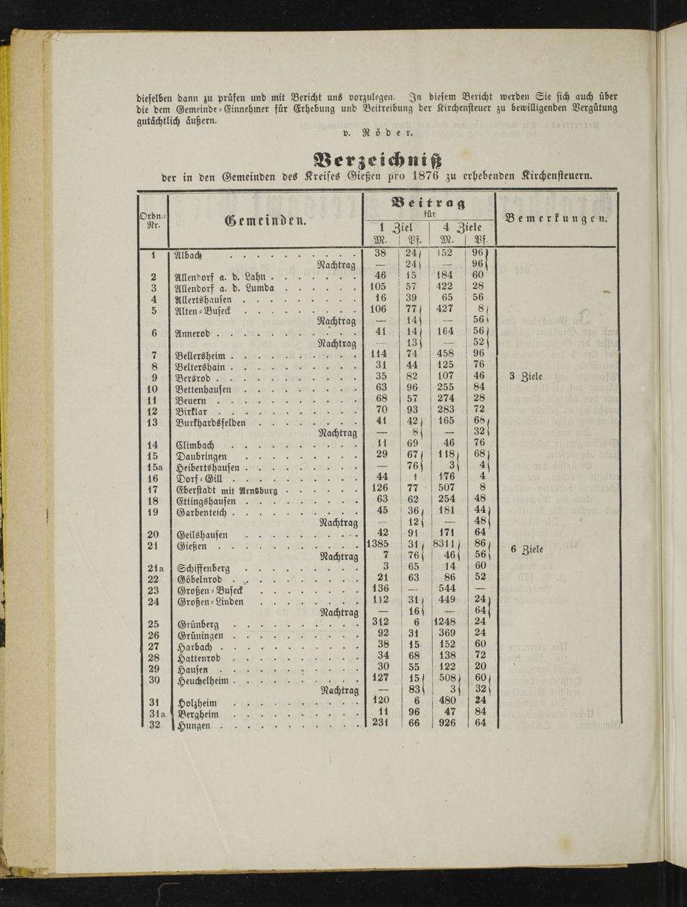 der in den Gemeinden des Kreises Gießen pro 1876 zu erhebenden Kirchensteuern.