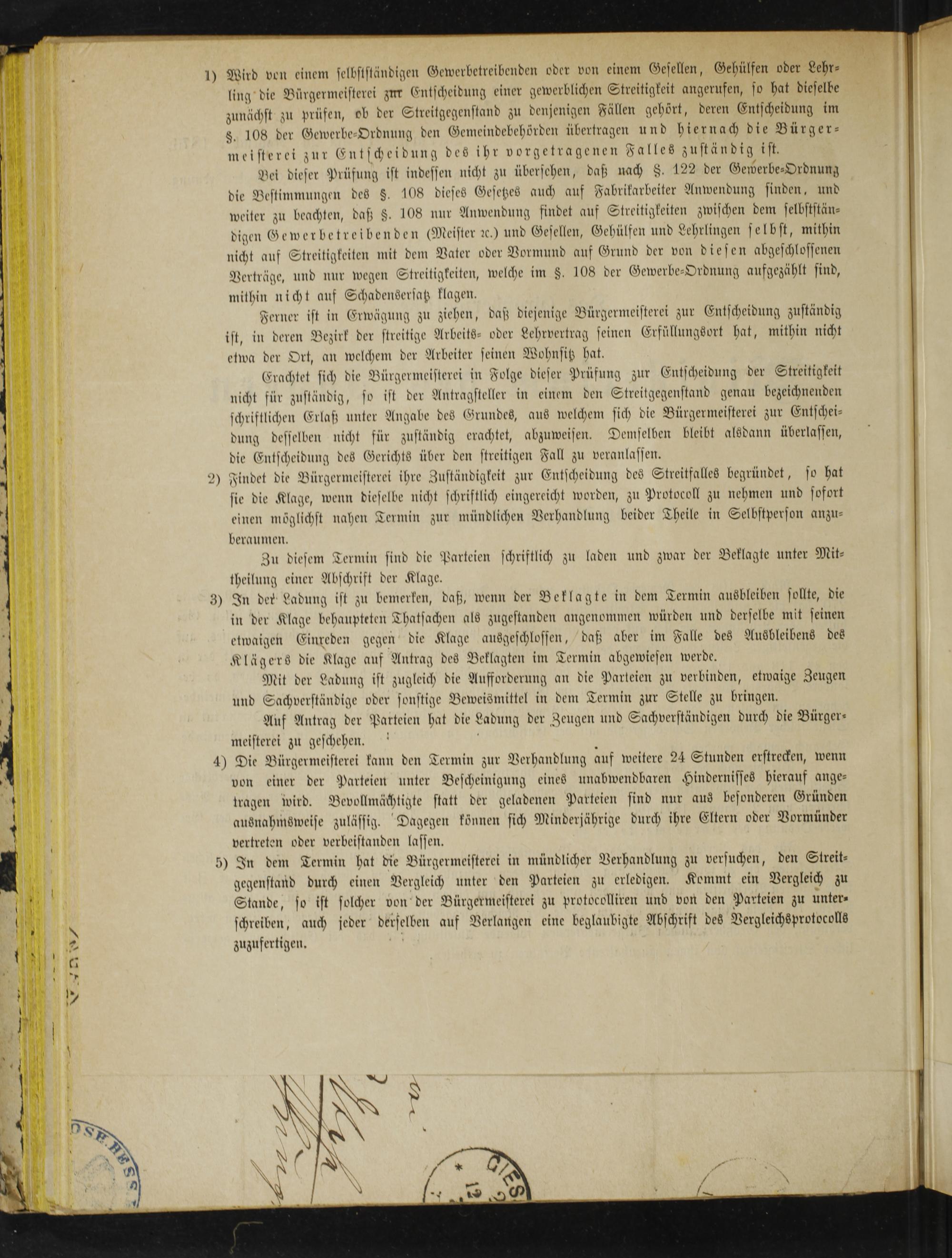 1) Wird ven einem selbstständigen Gewerbetreibenden oder von einem Gesellen, Gehülfen oder Lehr— ling die Bürgermeisterei zur Entscheidung einer gewerblichen Streitigkeit angerufen, so hat dieselbe zunächst zu prüfen, ob der Streitgegenstand zu denjenigen Fällen gehort, deren Entscheidung im F. 108 der Gewerbe-Ordnung den Gemeindebehörden übertragen und hiernach die Bürger— meisterei zur Entscheidung des ihr vorgetragenen Falles zuständig ist.