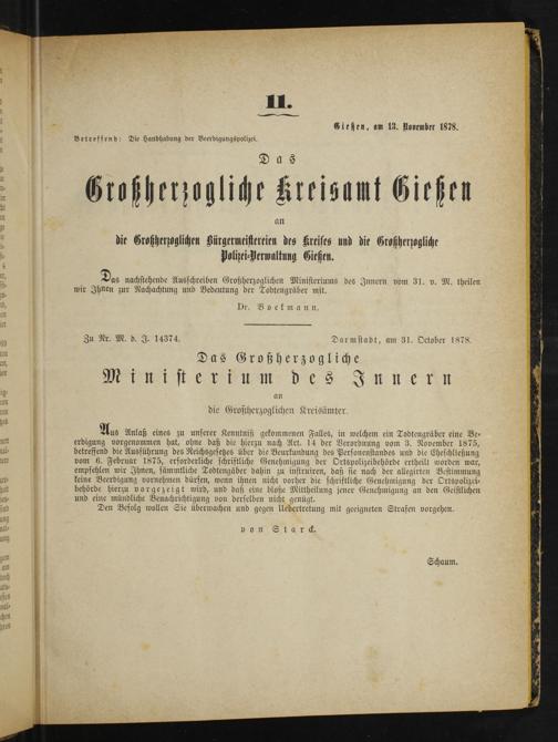 7 Giessen, am 13. November 1878. Betreffend: Die Handhabung der Beerdigungspolizei.