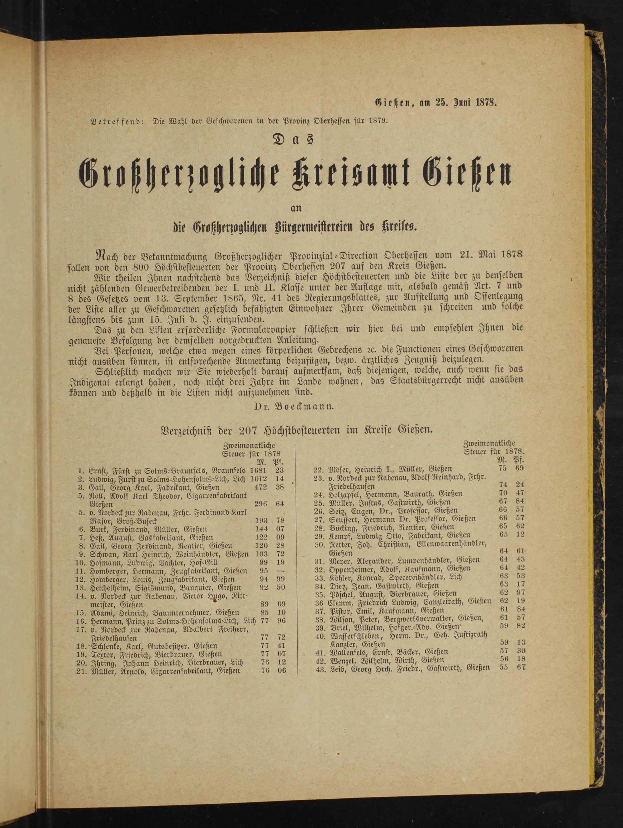 Nach der Bekanntmachung Großherzoglicher Provinzial-Direction Oberhessen vom 21. Mai 1878 fallen von den 800 Höchstbesteuerten der Provinz Oberhessen 207 auf den Kreis Gießen.