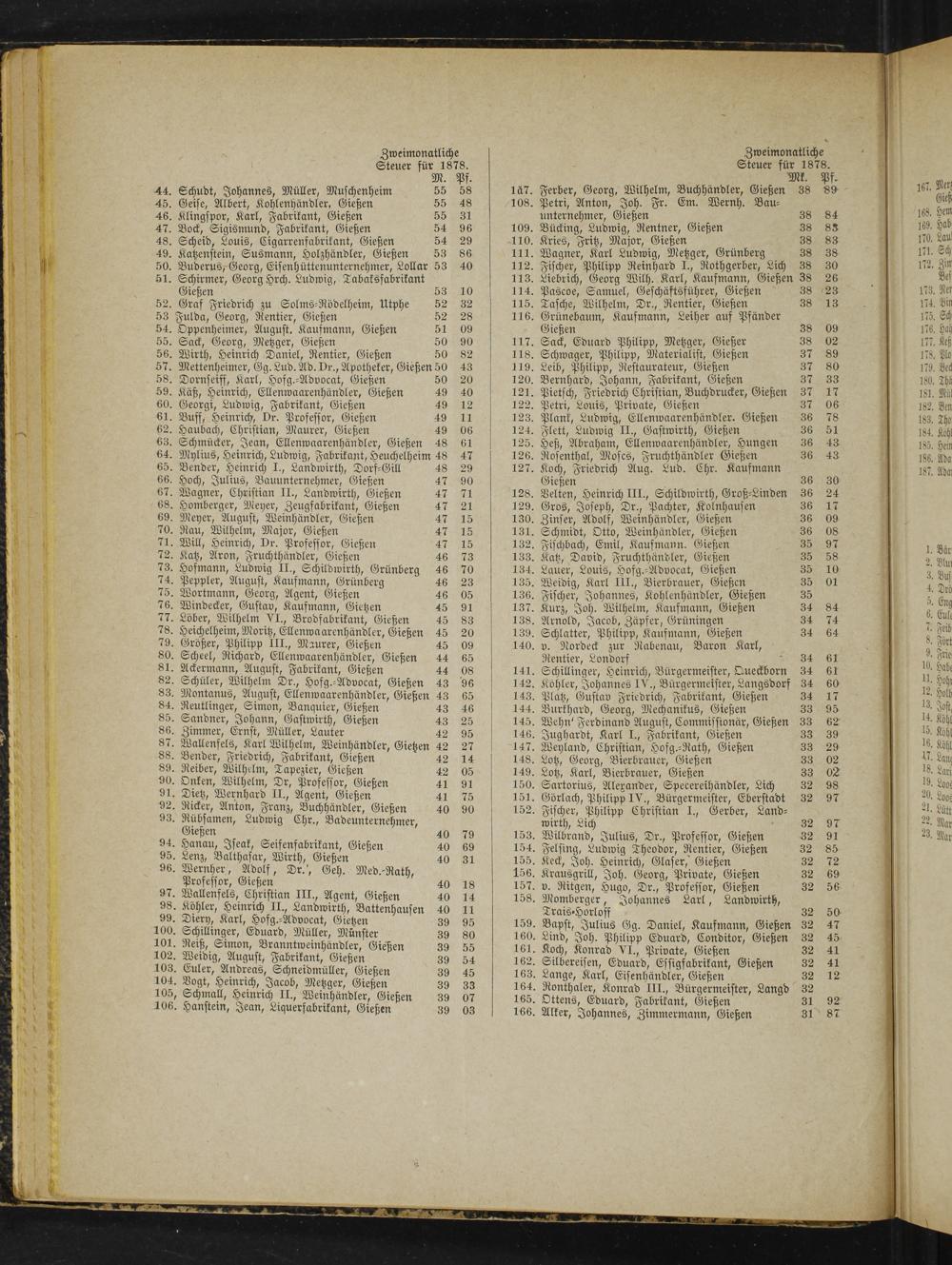 Gießen 38 09 117. Sack, Eduard Philipp, Metzger, Gießer 38 02 118. Schwager, Philipp, Materialist, Gießen 37 89 119. Leib, Philipp, Restaurateur, Gießen 3 2 120. Bernhard, Johann, Fabrikant, Gießen 3 121. Pietsch, Friedrich Christian, Buchdrucker, Gießen 37 17 122. Petri, Louis, Private, Gießen 9 05 123. Plank, Ludwig, Ellenwaarenhändler. Gießen 36 78 124. Flett, Ludwig II., Gastwirth, Gießen 36 51 125. Heß, Abraham, Ellenwaarenhändler, Hungen 36 43 126. Rosenthal, Moses, Fruchthändler Gießen 36 43 127. Koch, Friedrich Aug. Lud. Chr. Kaufmann