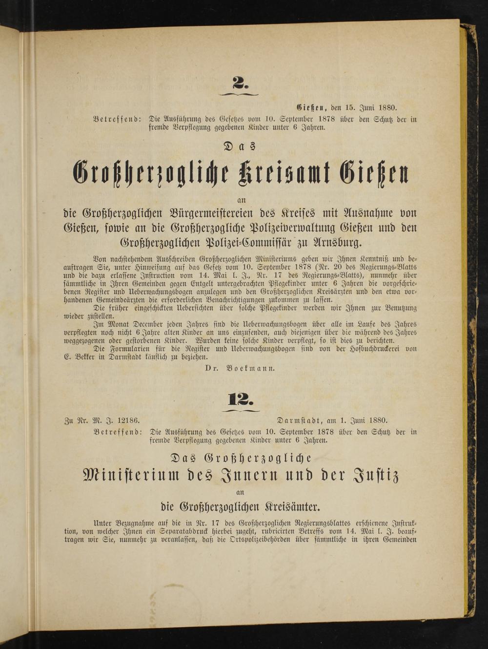 Von nachstehendem Ausschreiben Großherzoglichen Ministeriums geben wir Ihnen Kenntniß und be— auftragen Sie, unter Hinweisung auf das Gesetz vom 10. September 1878(Nr. 20 des Regierungs-Blatts und die dazu erlassene Instruction vom 14. Mai l. J., Nr. 17 des Regierungs-Blatts), nunmehr über sämmtliche in Ihren Gemeinden gegen Entgelt untergebrachten Pflegekinder unter 6 Jahren die vorgeschrie— benen Register und Ueberwachungsbogen anzulegen und den Großherzoglichen Kreisärzten und den etwa vor— handenen Gemeindeärzten die erforderlichen Benachrichtigungen zukommen zu lassen.