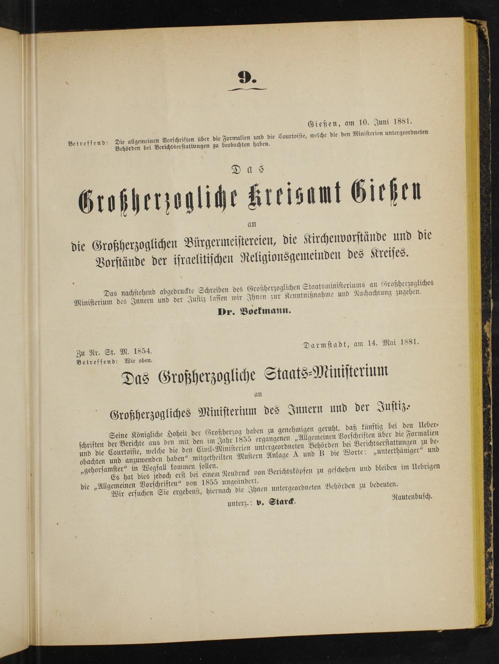 Zu Nr. St. M. 1854. Darmstadt, am 14. Mai 1881. Betreffend: Wie oben.