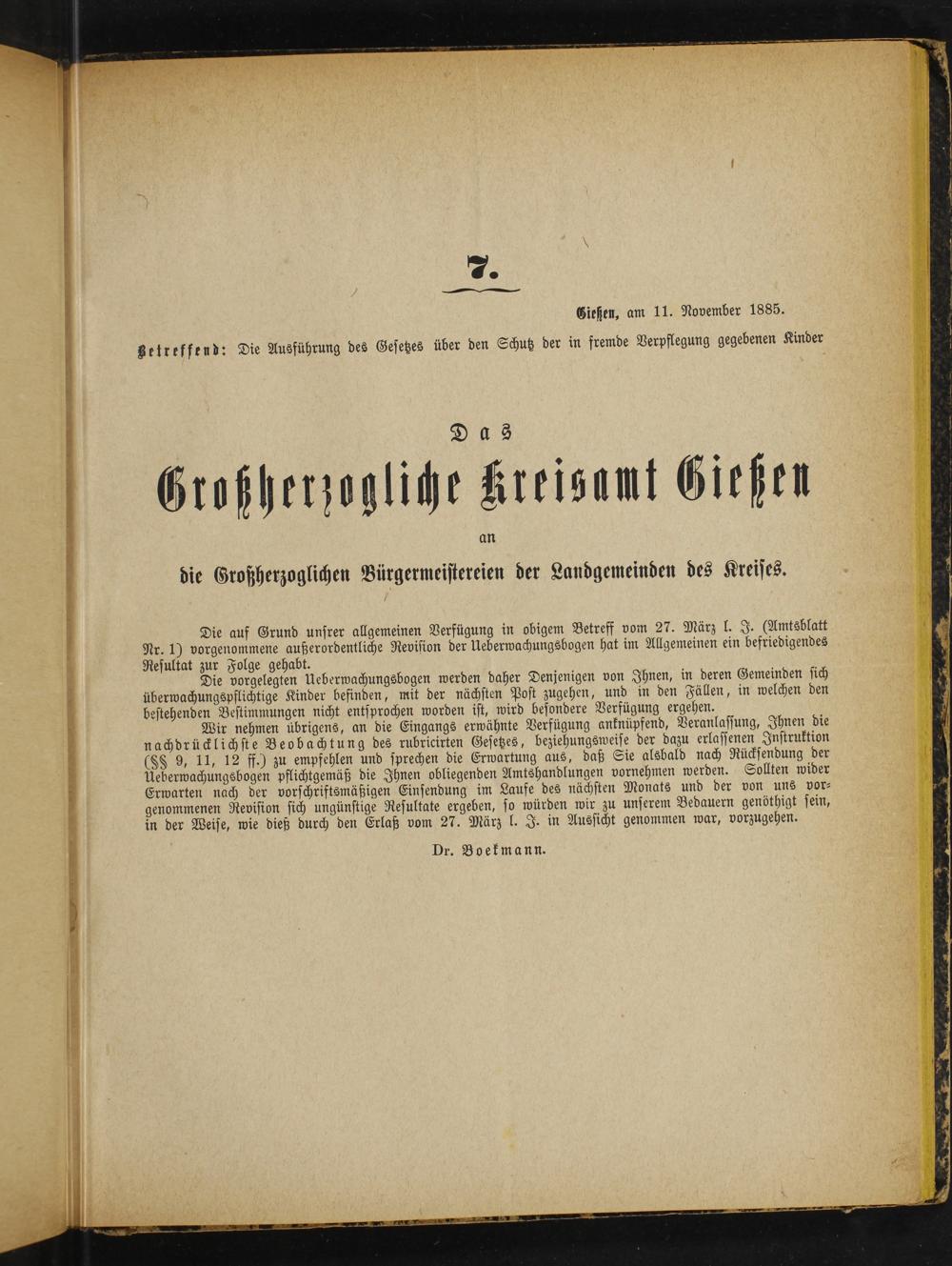 Die vorgelegten Ueberwachungsbogen werden daher Denjenigen von Ihnen, in deren Gemeinden sich überwachungspflichtige Kinder befinden, mit der nächsten Post zugehen, und in den Fällen, in welchen den bestehenden Bestimmungen nicht entsprochen worden ist, wird besondere Verfügung ergehen.