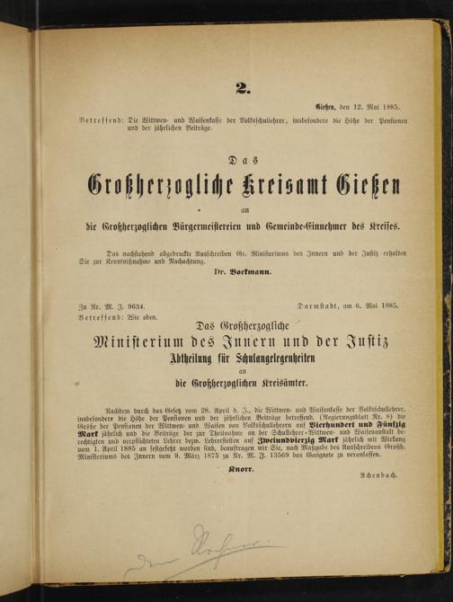 Mark jährlich und die Beiträge der zur Theilnahme an der Schullehrer-Wittwen— und Waisenanstalt be⸗ rechtigten und verpflichteten Lehrer bezw. Lehrerstellen auf Zweiundvierzig Mark jährlich mit Wirkung vom 1. April 1885 an festgesetzt worden sind, beauftragen wir Sie, nach Maßgabe des Ausschreibens Großh. Ministeriums des Innern vom 9. März 1875 zu Nr. M. J. 13569 das Geeignete zu veranlassen.
