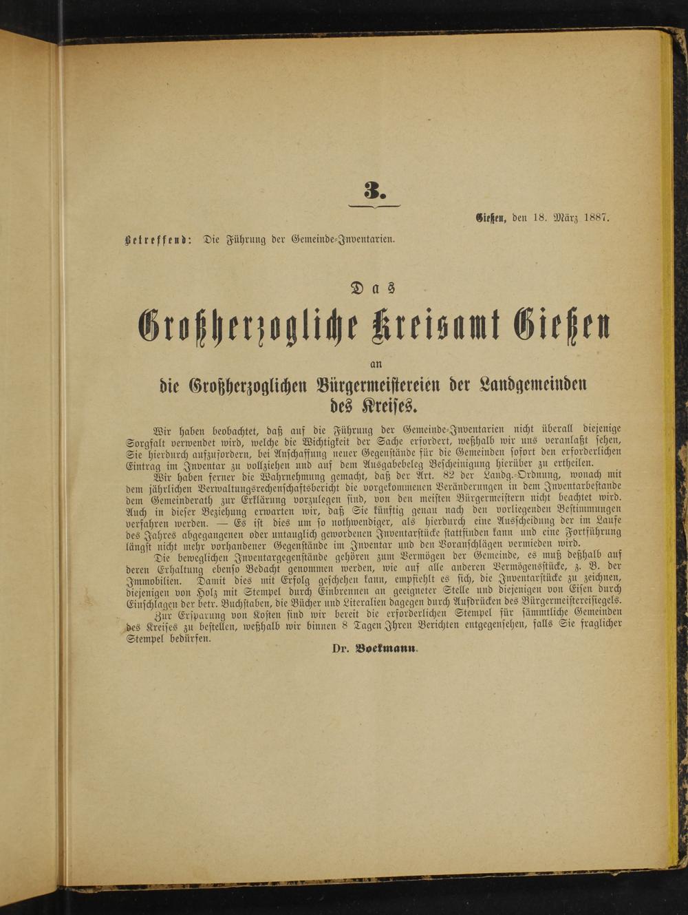 Wir haben beobachtet, daß auf die Führung der Gemeinde⸗Inventarien nicht überall diejenige Sorgfalt verwendet wird, welche die Wichtigkeit der Sache erfordert, weßhalb wir uns veranlaßt sehen, Sie hierdurch aufzufordern, bei Anschaffung neuer Gegenstände für die Gemeinden sofort den erforderlichen Eintrag im Inventar zu vollziehen und auf dem Ausgabebeleg Bescheinigung hierüber zu ertheilen.