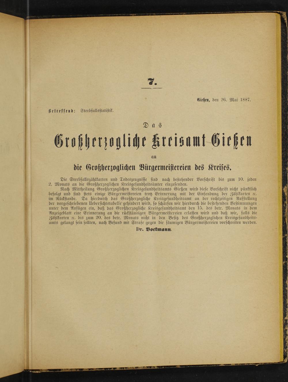 Nach Mittheilung Großherzoglichen Kreisgesundheitsamts Gießen wird diese Vorschrift nicht pünktlich befolgt und sind stets einige Bürgermeistereien trotz Erinnerung mit der Einsendung der Zählkarten ꝛc. im Rückstande. Da hierdurch das Großherzogliche Kreisgesundheitsamt an der rechtzeitigen Aufstellung der vorgeschriebenen Uebersichtstabelle gehindert wird, so schärfen wir hierdurch die bestehenden Bestimmungen unter dem Anfügen ein, daß das Großherzogliche Kreisgesundheitsamt den 15. des betr. Monats in dem Anzeigeblatt eine Erinnerung an die rückständigen Bürgermeistereien erlassen wird und daß wir, falls die Zählkarten ꝛc. bis zum 20. des betr. Monats nicht in den Besitz des Großherzoglichen Kreisgesundheits⸗ amts gelangt sein sollten, nach Befund mit Strafe gegen die säumigen Bürgermeistereien vorschreiten werden.