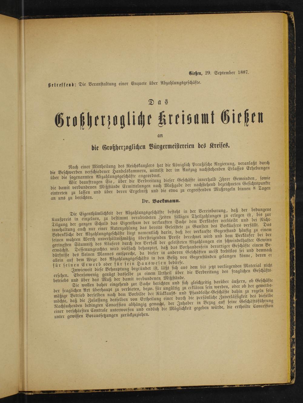 Gießen, 29. September 1887. getreffend: Die Veranstaltung einer Enquete über Abzahlungsgeschäfte.