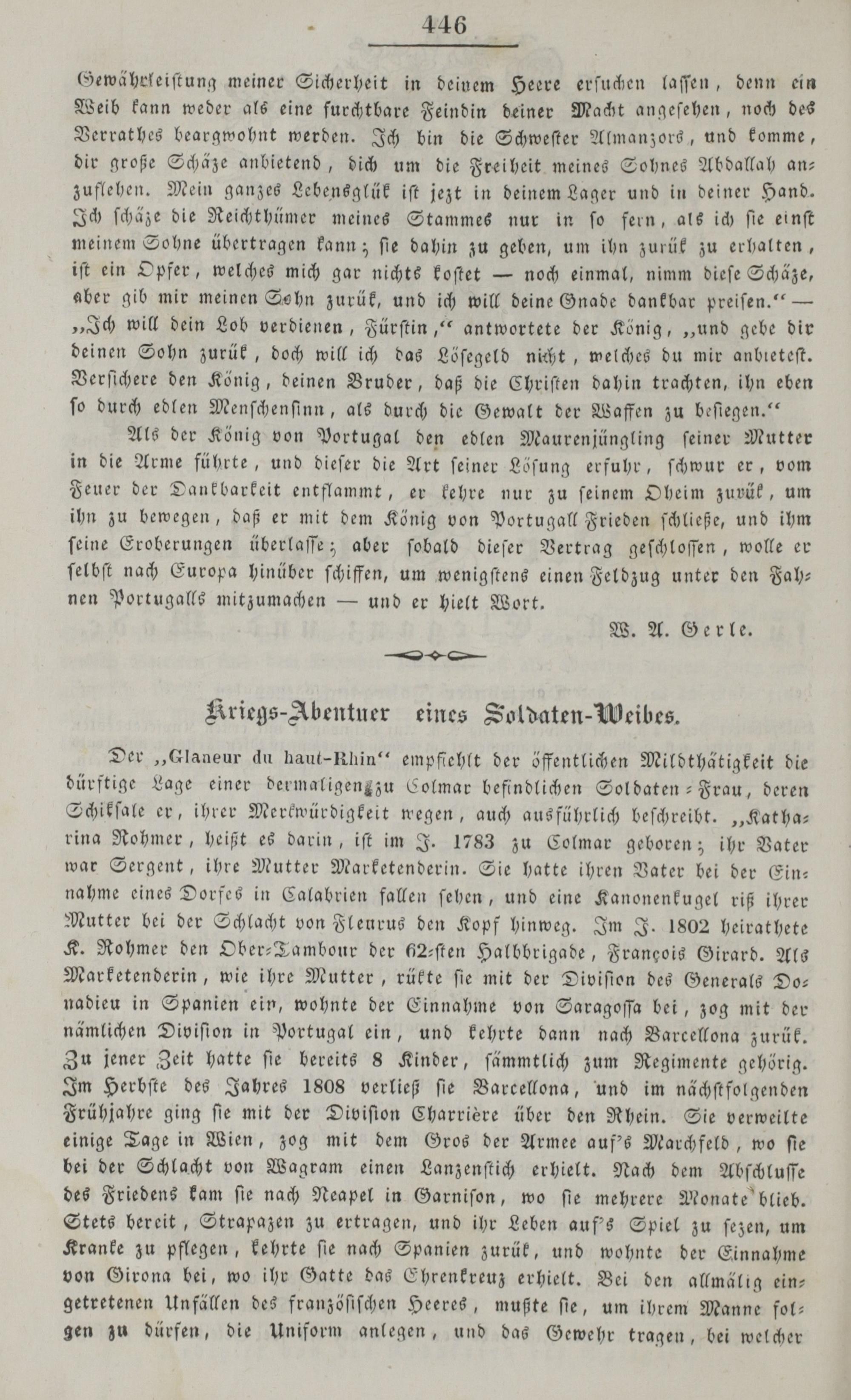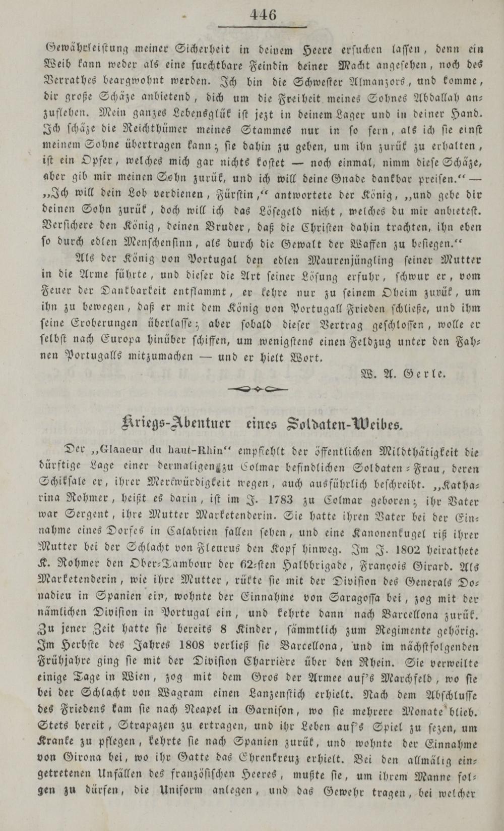 Der„Glaneur du haut-Rhin““ empfiehlt der öffentlichen Mildthätigkeit die dürftige Lage einer dermaligengzu Colmar befindlichen Soldaten- Frau, deren Schikſale er, ihrer Merkwürdigkeit wegen, auch ausführlich beſchreibt.„Kat ha— rina Rohmer, heißt es darin, iſt im J. 1783 zu Colmar geboren; ihr Vater war Sergent, ihre Mutter Marketenderin. Sie hatte ihren Vater bei der Ein— nahme eines Dorfes in Calabrien fallen ſehen, und eine Kanonenkugel riß ihrer Mutter bei der Schlacht von Fleurus den Kopf hinweg. Im J. 1802 heirathete K. Rohmer den Ober-Tambour der 625ſten Halbbrigade, Frangois Girard. Als Marketenderin, wie ihre Mutter, rükte ſie mit der Diviſton des Generals Do— nadieu in Spanien ein, wohnte der Einnahme von Saragoſſa bei, zog mit der nämlichen Diviſion in Portugal ein, und kehrte dann nach Varcellona zurük. Zu jener Zeit hatte ſie bereits 8 Kinder, ſämmtlich zum Regimente gehörig. Im Herbſte des Jahres 1808 verließ ſie Barcellona, und im nächſtfol genden Frühjahre ging ſie mit der Diviſion Charrière über den Rhein. Sie verweilte einige Tage in Wien, zog mit dem Gros der Armee auf's Marchfeld, wo ſie bei der Schlacht von Wagram einen Lanzenſtich erhielt. Nach dem Abſchluſſe des Friedens kam ſie nach Neapel in Garniſon, wo ſie mehrere Monate blieb. Stets bereit, Strapazen zu ertragen, und ihr Leben auf's Spiel zu ſezen, um Kranke zu pflegen, kehrte ſie nach Spanien zurük, und wohnte der Einnahme von Girona bei, wo ihr Gatte das Ehrenkreuz erhielt. Bei den allmälig ein— getretenen Unfällen des franzöſiſchen Heeres, mußte ſie, um ihrem Manne fol— gen zu dürfen, die Uniform anlegen, und das Gewehr tragen, bei welcher