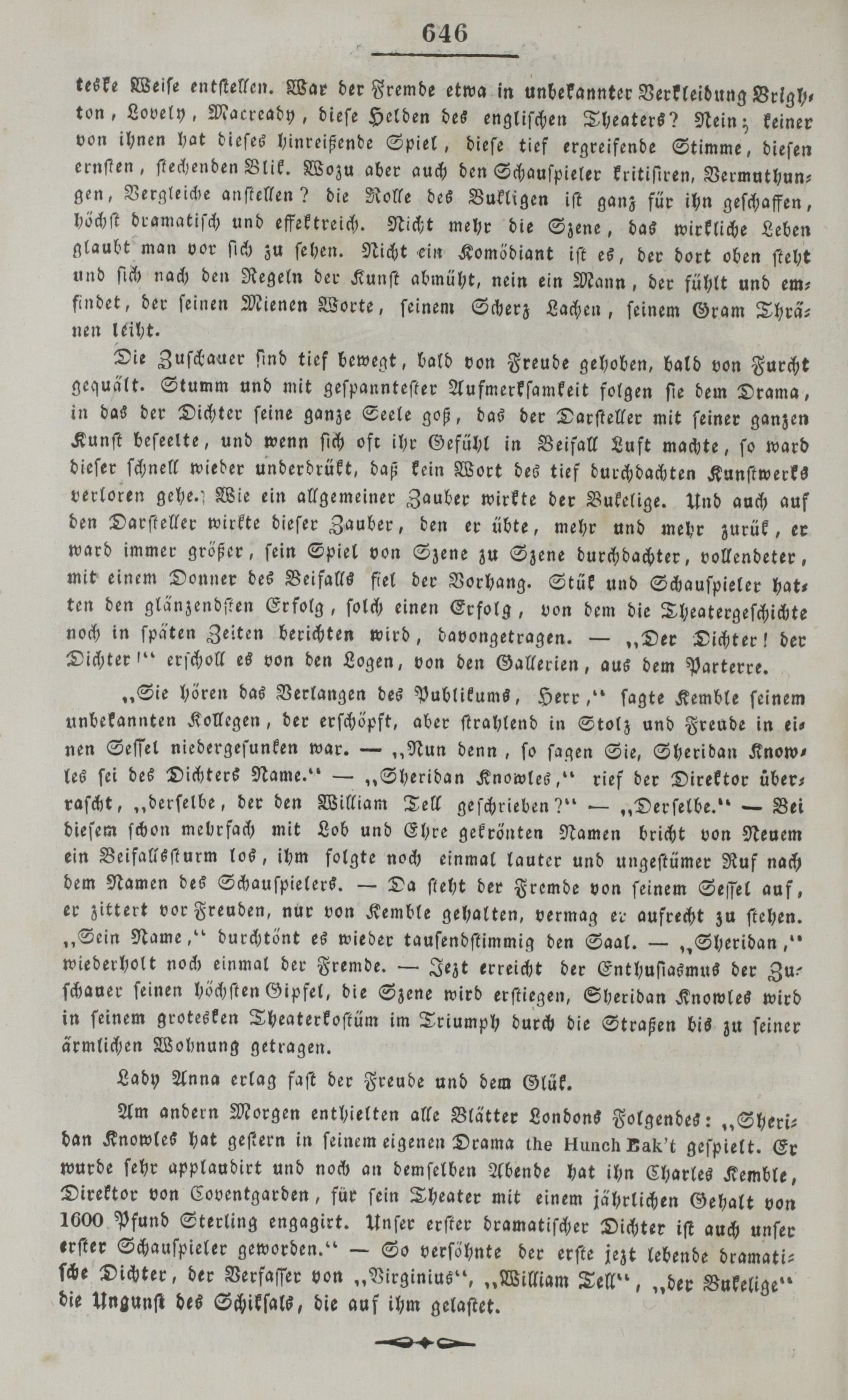 „Sie hören das Verlangen des Publikums, Herr,“ ſagte Kemble ſeinem unbekannten Kollegen, der erſchöpft, aber ſtrahlend in Stolz und Freude in ei⸗ nen Seſſel niedergeſunken war.—„Nun denn, ſo ſagen Sie, Sheridan Know— les ſei des Dichters Name.“—„Sheridan Knowles,“ rief der Direktor über— raſcht,„derſelbe, der den William Tell geſchrieben?“—„Derſelbe.““— Bei dieſem ſchon mehrfach mit Lob und Ehre gekrönten Namen bricht von Neuem ein Beifallsſturm los, ihm folgte noch einmal lauter und ungeſtümer Ruf nach dem Namen des Schauſpielers.— Da ſteht der Fremde von ſeinem Seſſel auf, er zittert vor Freuden, nur von Kemble gehalten, vermag er aufrecht zu ſtehen. „Sein Name,“ durchtönt es wieder tauſendſtimmig den Saal.—„Sheridan,“ wiederholt noch einmal der Fremde.— Jezt erreicht der Ent huſiasmus der Zu— ſchauer ſeinen höchſten Gipfel, die Szene wird erſtiegen, Sheridan Knowles wird in ſeinem grotesken Theaterkoſtüm im Triumph durch die Straßen bis zu ſeiner ärmlichen Wohnung getragen.