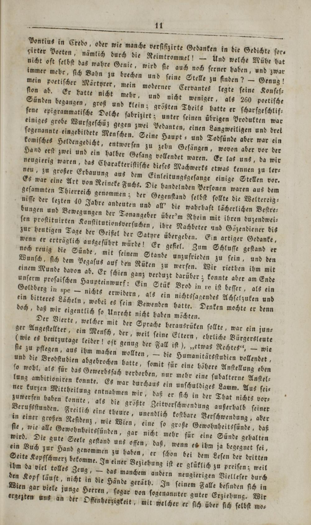 komiſches Heldengedicht, entworfen zu zehn Geſangen, wovon aber vor der Hand erſt zwei und ein halber Geſang vollendet waren. Er las uns, da wir neugierig waren, das Charakteriſtiſche dieſes Machwerks etwas kennen zu ler⸗ neu, zu großer Erbauung aus dem Einleitungsgeſange einige Stellen vor. Es war eine Art von Reineke Fuchs. Die handelnden Perſonen waren aus dem geſammten Thierreich genommen; der Gegenſtand ſelbſt ſollte die Weltereig⸗ niſſe der lezten 40 Jahre andeuten und all' die wahrhaft lächerlichen Beſtre⸗ bungen und Bewegungen der Tonangeber über'm Rhein mit ihren du zendwei⸗ ſen proſtituirten Konſtitutionsverſuchen, ihre Nachbeter und Gözendiener bis zur heutigen Tage der Geißel der Satyre übergeben. Ein artiger Gedanke, wenn er erträglich ausgeführt würde! Er geſſel. Zum Schluſſe geſtand er noch reuig die Sünde, mit ſeinem Stande unzufrieden zu ſein, und den Wunſch, ſich dem Vegaſus auf den Rüken zu werfen. Wir riethen ihm mit einem Munde davon ab. Er ſchien ganz verduzt darüber; konnte aber am Ende unſerm proſaiſchen Haupteinwurf: Ein Stük Brod in re iſt beſſer, als ein Goldberg in pe— nichts erwidern, als ein nichtsſagendes Achſelzuken und ein bitteres Lächeln, wobei es ſein Vewenden hatte. Denken mochte er denn doch, daß wir eigentlich ſo Unrecht nicht haben möchten.