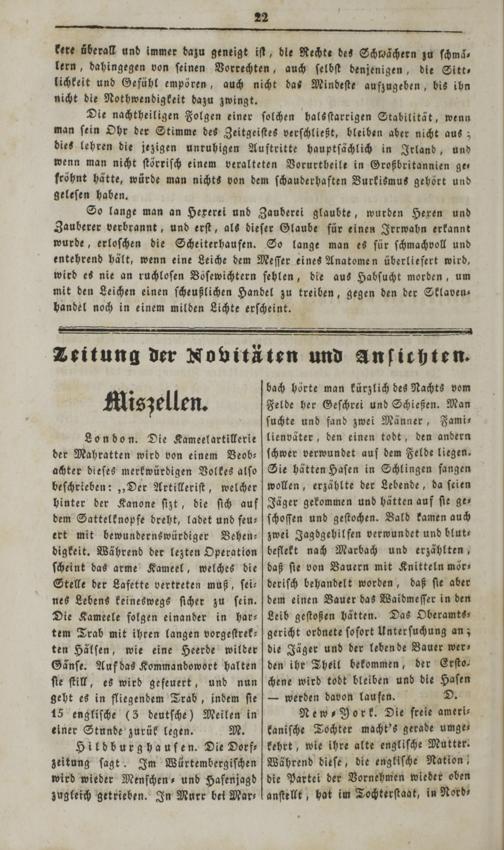 Die nachtheiligen Folgen einer ſolchen halsſtarrigen Stabilität, wenn man ſein Ohr der Stimme des Zeitgeiſtes verſchließt, bleiben aber nicht aus; dies lehren die jezigen unruhigen Auftritte hauptſächlich in Irland, und wenn man nicht ſtörriſch einem veralteten Vorurtheile in Großbritannien ge— fröhnt hätte, würde man nichts von dem ſchauderhaften Vurkismus gehört und geleſen haben.