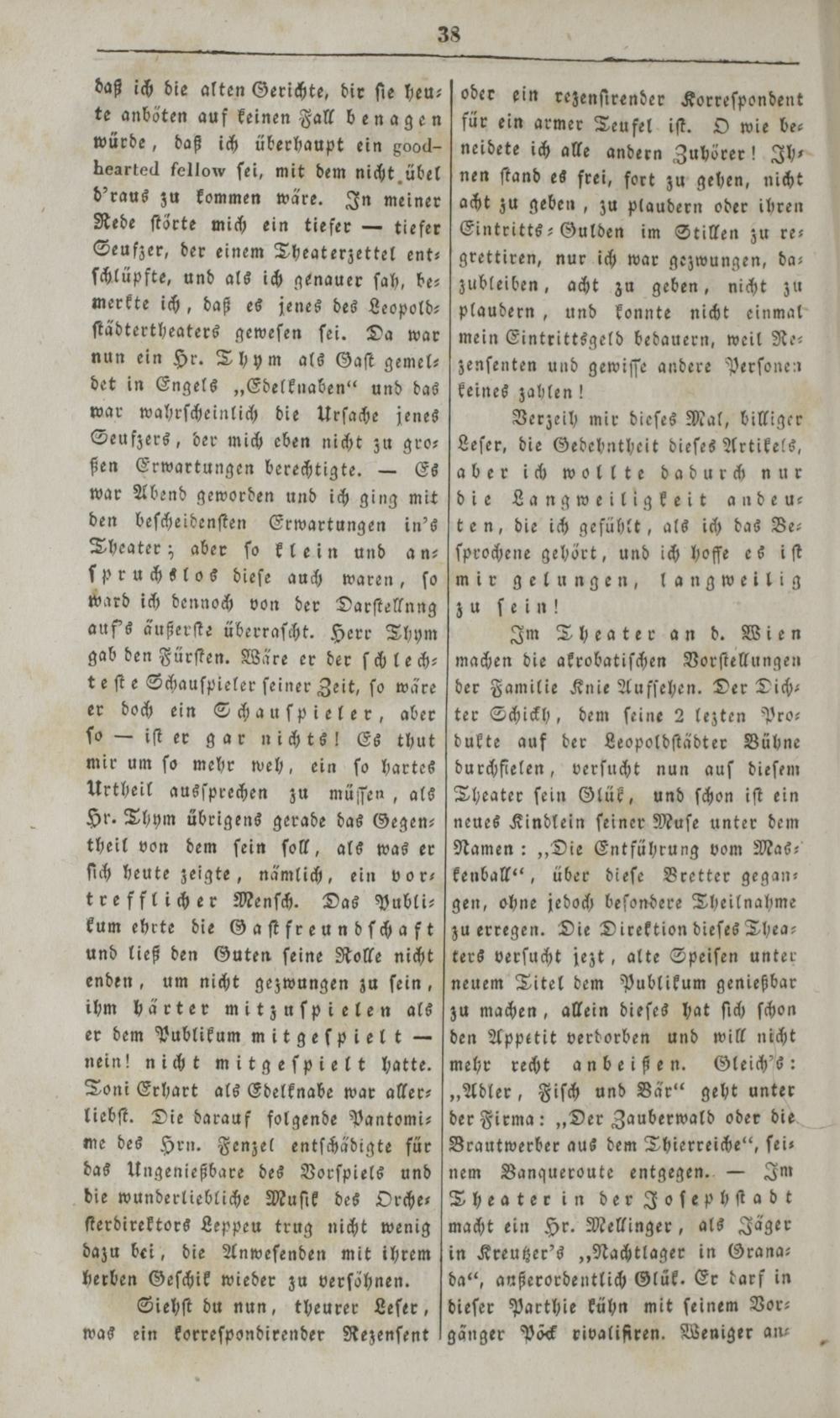 daß ich die alten Gerichte, dir ſie heu— te anböten auf keinen Fall benagen würde, daß ich überhaupt ein good hearted fellow ſei, mit dem nicht übel d'raus zu kommen wäre. In meiner Rede ſtörte mich ein tiefer— tiefer Seufzer, der einem Theaterzettel ent— ſchlüpfte, und als ich genauer ſah, be— merkte ich, daß es jenes des Leopold⸗ ſtädtertheaters geweſen ſei. Da war nun ein Hr. Thym als Gaſt gemel— det in Engels„Edelknaben“ und das war wahrſcheinlich die Urſache jenes Seufzers, der mich eben nicht zu gro— ßen Erwartungen berechtigte.— Es war Abend geworden und ich ging mit den beſcheidenſten Erwartungen in's Theater; aber ſo klein und an⸗ ſpruchslos dieſe auch waren, ſo ward ich dennoch von der Darſtellnng auf's äußerſte überraſcht. Here Thym gab den Fürſten. Wäre er der ſchlech— te ſte Schauſpieler ſeiner Zeit, ſo wäre er doch ein Schauſpieler, aber ſo— iſt er gar nichts! Es thut mir um ſo mehr weh, ein ſo hartes Urtheil ausſprechen zu müſſen, als Hr. Thym übrigens gerade das Gegen— theil von dem ſein ſoll, als was er ſich heute zeigte, namlich, ein vor— trefflicher Menſch. Das Publi⸗ kum ehrte die Gaſtfreundſchaft und ließ den Guten ſeine Rolle nicht enden, um nicht gezwungen zu ſein, ihm härter mitzuſpielen als er dem Publikum mit geſpielt— nein! nicht mitgeſpielt hatte. Toni Erhart als Edelknabe war aller— liebſt. Die darauf folgende Pantomi⸗ me des Hrn. Fenzel entſchädigte für das Ungenießbare des Vorſpiels und die wunderliebliche Muſik des Orche— ſterdirektors Leppeu trug nicht wenig dazu bei, die Anweſenden mit ihrem herben Geſchik wieder zu verſöhnen. Siehſt du nun, theurer Leſer, was ein korreſpondirender Rezenſent