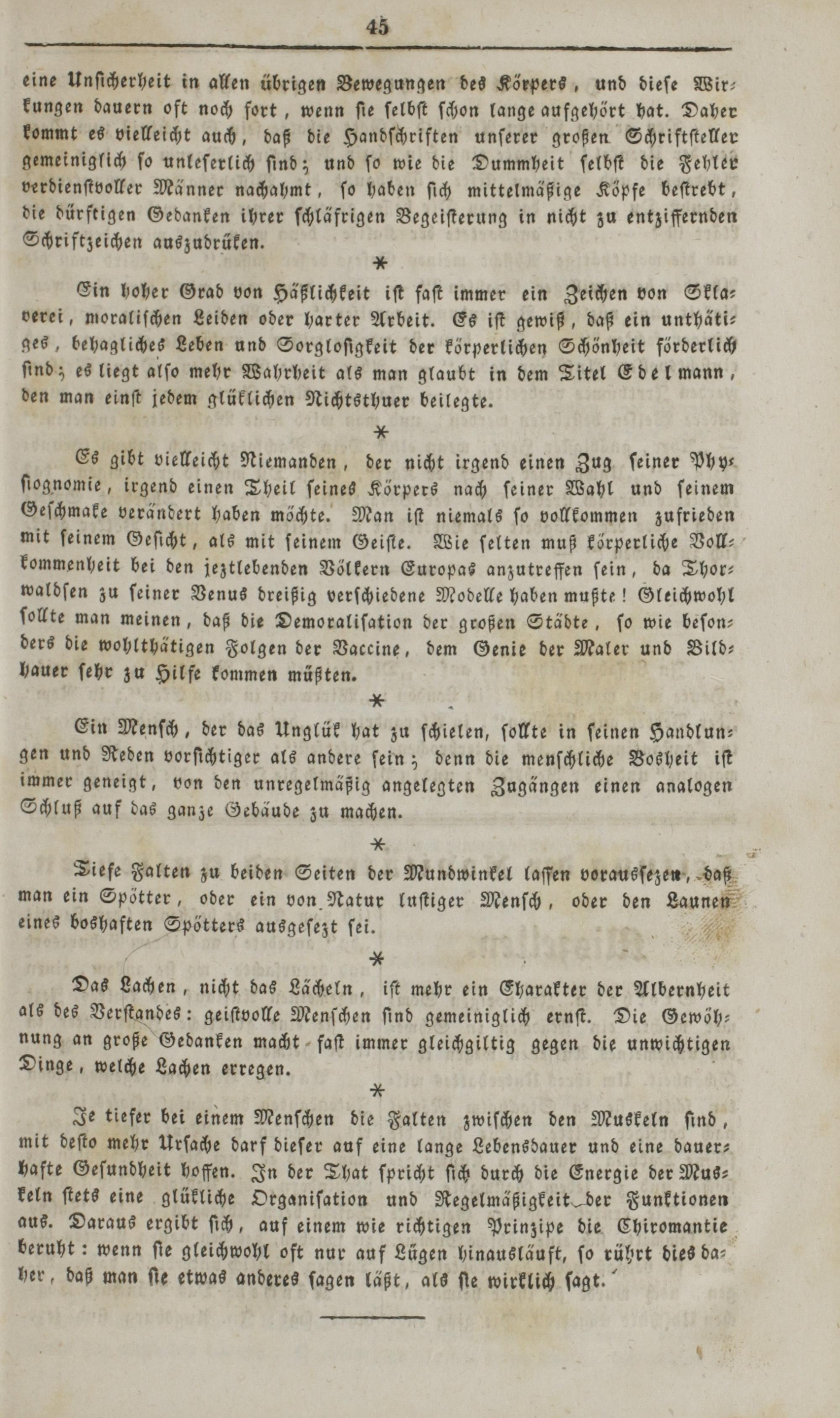 Ein Menſch, der das Unglük hat zu ſchielen, ſollte in ſeinen Handlun— gen und Reden vorſichtiger als andere ſein; denn die menſchliche Vosheit iſt immer geneigt, von den unregelmäßig angelegten Zugängen einen analogen Schluß auf das ganze Gebäude zu machen.