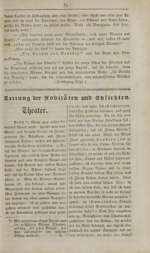 Peſth) Wenn man nichts be— ſonders Neues weiß, ſpricht man vom Wetter und beinahe könnte ich Ihnen, geehrter Hr. Redakteur und Ihren ſchäzbaren Leſern, nichts als meteoro— logiſche Nachrichten mittheilen, z. B., daß der Winter, der ſo ziemlich gelinde begonnen, nun endlich ſeine Rechte be— hauptet und eine ſtrengere Natur an— nimmt, daß Voreas mit vollen Baken bläſt, daß der Schnee fußhoch liegt und daß die Donau ſchon viel Treibeis fübrt, de. Aber die Wetter-Konver⸗ ſation iſt, wie bekannt, etwas ſehr Abgenüztes und ſeitdem unſere politi— ſchen Zeitungen in jeder Nummer ih— ren Leſern vor allen andern Neuigkei— ten anzeigen, ob es geſtern oder vor— geſtern geregnet oder geſchneiet hat, ob der Barometer geſtiegen oder gefal—
