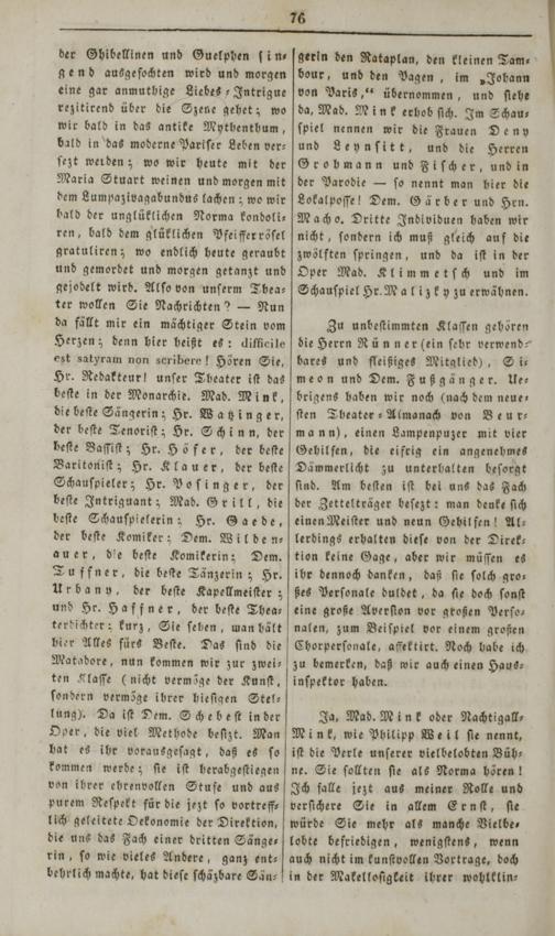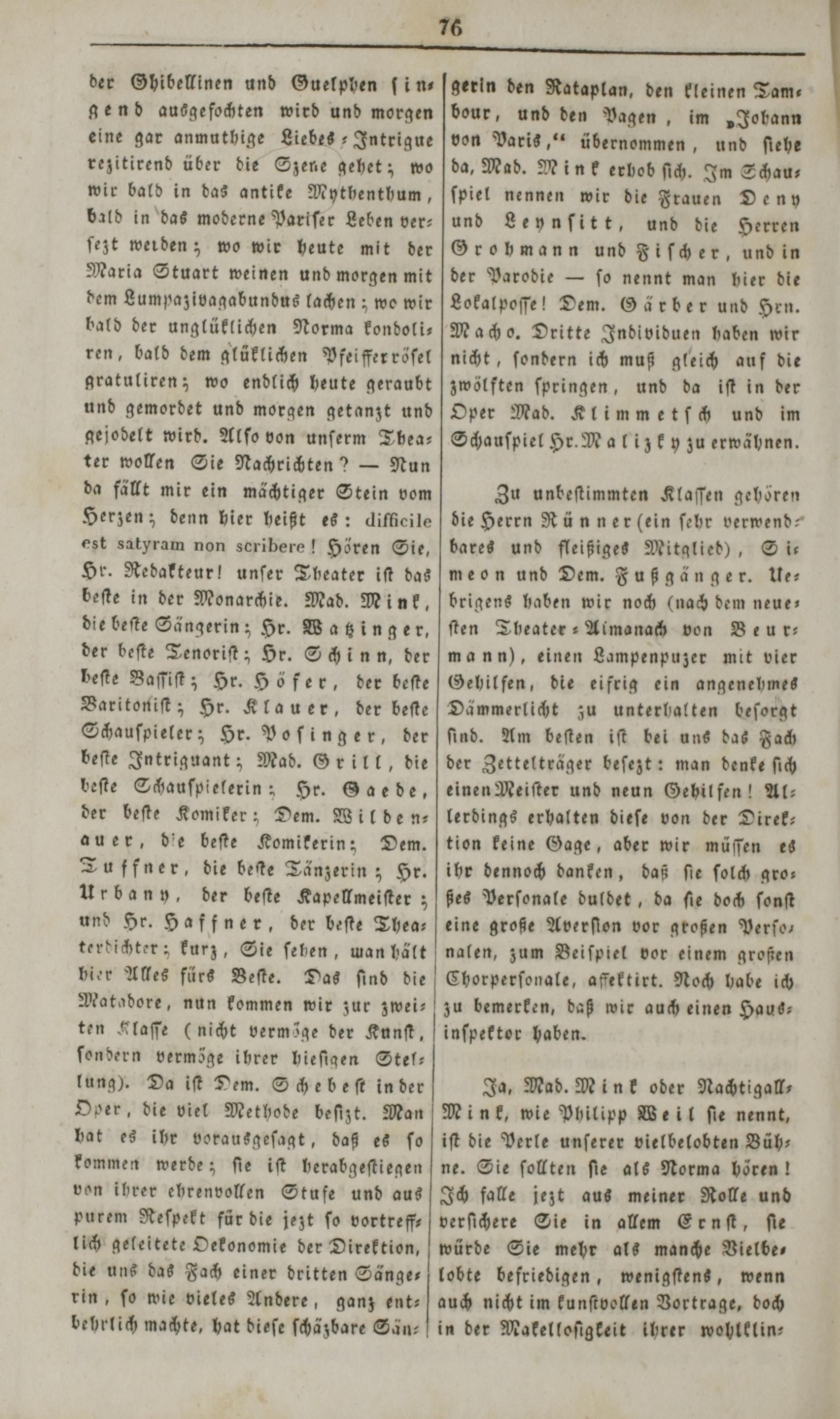 der Ghibellinen und Guelphen ſin⸗ gend ausgefochten wird und morgen eine gar anmuthige Liebes-Intrigue rezitirend über die Szene gehet; wo wir bald in das antike Mythenthum, bald in das moderne Pariſer Leben ver— ſezt werden; wo wir heute mit der Maria Stuart weinen und morgen mit dem Lumpazivagabundus lachen; wo wir bald der unglüklichen Norma kondoli— ren, bald dem glüklichen Pfeiffer röſel gratuliren; wo endlich heute geraubt und gemordet und morgen getanzt und gejodelt wird. Alſo von unſerm Thea— ter wollen Sie Nachrichten?— Nun da fällt mir ein mächtiger Stein vom Herzen; denn hier heißt es: difliile est satyram non seribere! Hören Sie, Hr. Redakteur! unſer Theater iſt das beſte in der Monarchie. Mad. Mink, die beſte Sängerin; Hr. Watzinger, der beſte Tenoriſt; Hr. Schinn, der beſte Baſſiſt; Hr. Höfer, der beſte Baritoniſt; Hr. Klauer, der beſte Schauſpieler; Hr. Poſinger, der beſte Intriguant; Mad. Grill, die beſte Schauſpielerin; Hr. Gae de, der beſte Komiker; Dem. Wil de n⸗ auer, die beſte Komikerin; Dem. Tuffner, die beſte Tänzerin; Hr. Urbany, der beſte Kapellmeiſter 3 und Hr. Haffner, der beſte Thea— terdichter; kurz, Sie ſeben, wan hält hier Alles fürs Veſte. Das ſind die Matadore, nun kommen wir zur zwei— ten Klaſſe(nicht vermöge der Kunſt, ſondern vermöge ihrer hieſigen Stel— lung). Da iſt Dem. Schebeſt in der Oper, die viel Methode beſizt. Man bat es ihr vorausgeſagt, daß es ſo kommen werde; ſie iſt herabgeſtiegen von ihrer ehrenvollen Stufe und aus purem Reſpekt für die jezt ſo vortreff— lich geleitete Oekonomie der Direktion, die uns das Fach einer dritten Sänge— rin, ſo wie vieles Andere, ganz ent— behrlich machte, hat dieſe ſchäzbare Sän—