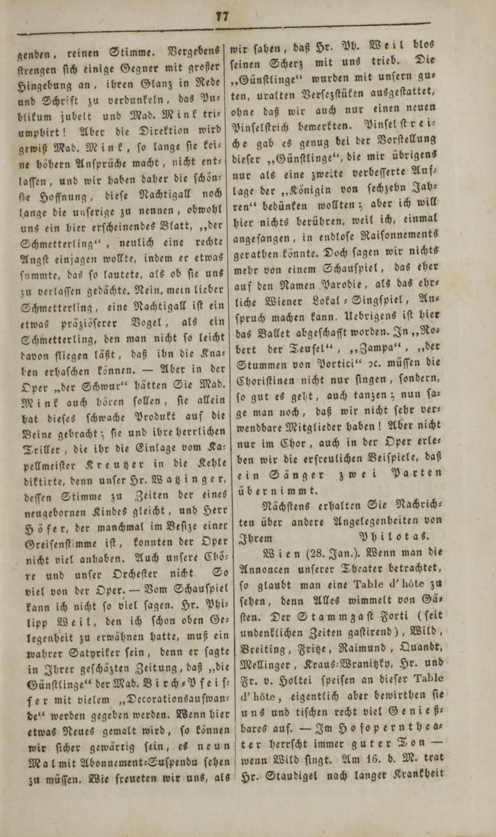 Wien(28. Jan.). Wenn man die Annoncen unſerer Theater betrachtet, ſo glaubt man eine Table d' hôte zu ſehen, denn Alles wimmelt von Gä— ſten. Der Stamm zaſt Forti(ſeit undenklichen Zeiten gaſtirend), Wild, Breiting, Fritze, Raimund, Quandt, Mellinger, Kraus-Wranitzky, Hr. und Fr. v. Holtei ſpeiſen an dieſer Table d' hôte, eigentlich aber bewirthen ſie uns und tiſchen recht viel Genie ß⸗ bares auf.— Im Ho fopernthea⸗ ter herrſcht immer guter Ton— wenn Wild ſingt. Am 16. d. M. trat Hr. Staudigel nach langer Krankheit