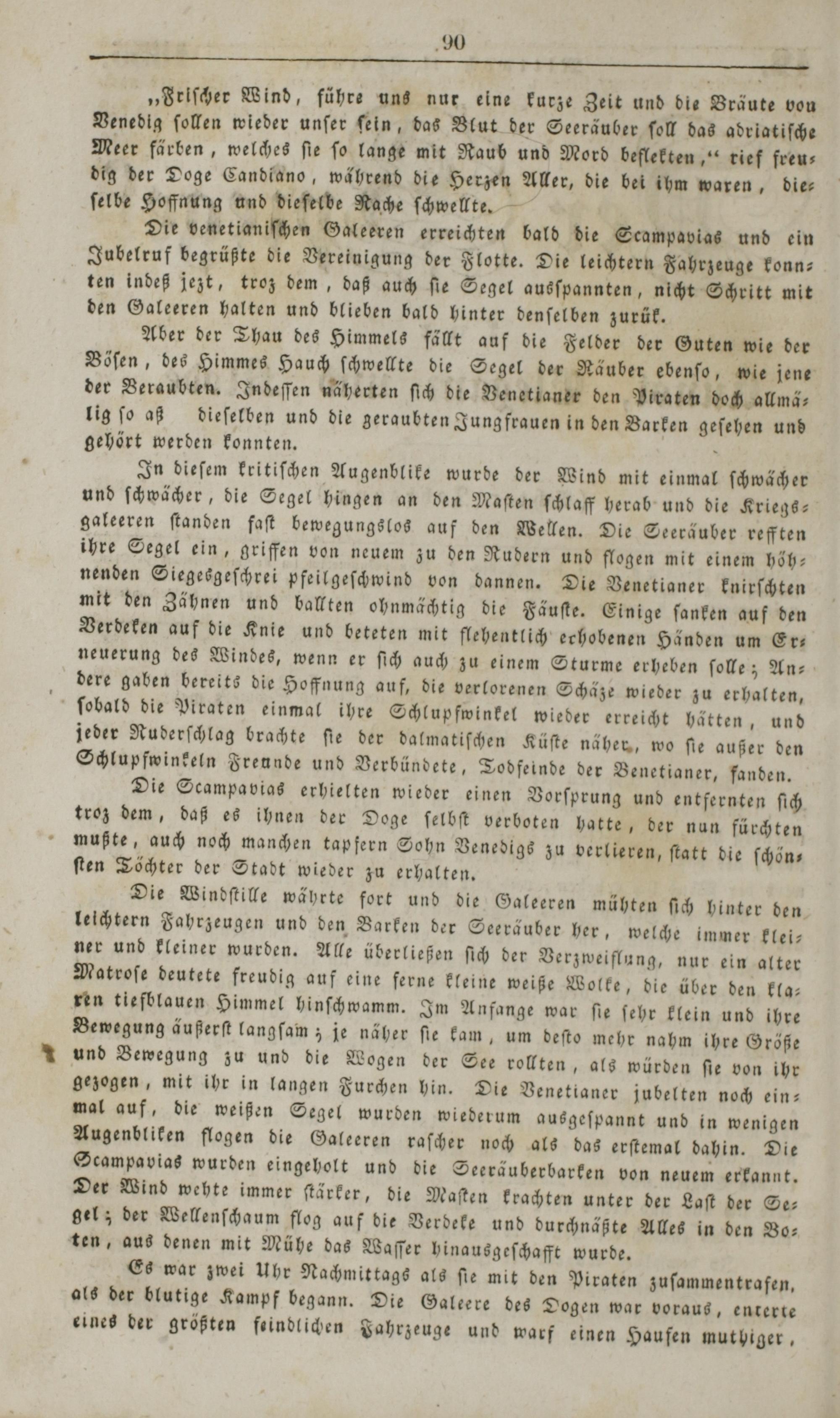 Die Windſtille währte fort und die Galeeren mühten ſich hinter den leichtern Fahrzeugen und den Barken der Seeräuber her, welche immer klei— ner und kleiner wurden. Alle überließen ſich der Verzweiflung, nur ein alter Matroſe deutete freudig auf eine ferne kleine weiße Wolke, die über den kla— ren tiefblauen Himmel hinſchwamm. Im Anfange war ſie ſehr klein und ihre Bewegung äußerſt langſam; je näher ſie kam, um deſto mehr nahm ihre Größe und Bewegung zu und die Wogen der See rollten, als würden ſie von ihr gezogen, mit ihr in langen Furchen hin. Die Venetianer jubelten noch ein⸗ mal auf, die weißen Segel wurden wiederum ausgeſpannt und in wenigen Augenbliken flogen die Galeeren raſcher noch als das erſtemal dahin. Die Scampavias wurden eingeholt und die Seeräuberbarken von neuem erkannt. Der Wind wehte immer ſtärker, die Maſten krachten unter der Laſt der Se— gel; der Wellenſchaum flog auf die Verdeke und durchnäßte Alles in den Vo— ten, aus denen mit Mühe das Waſſer hinausgeſchafft wurde.