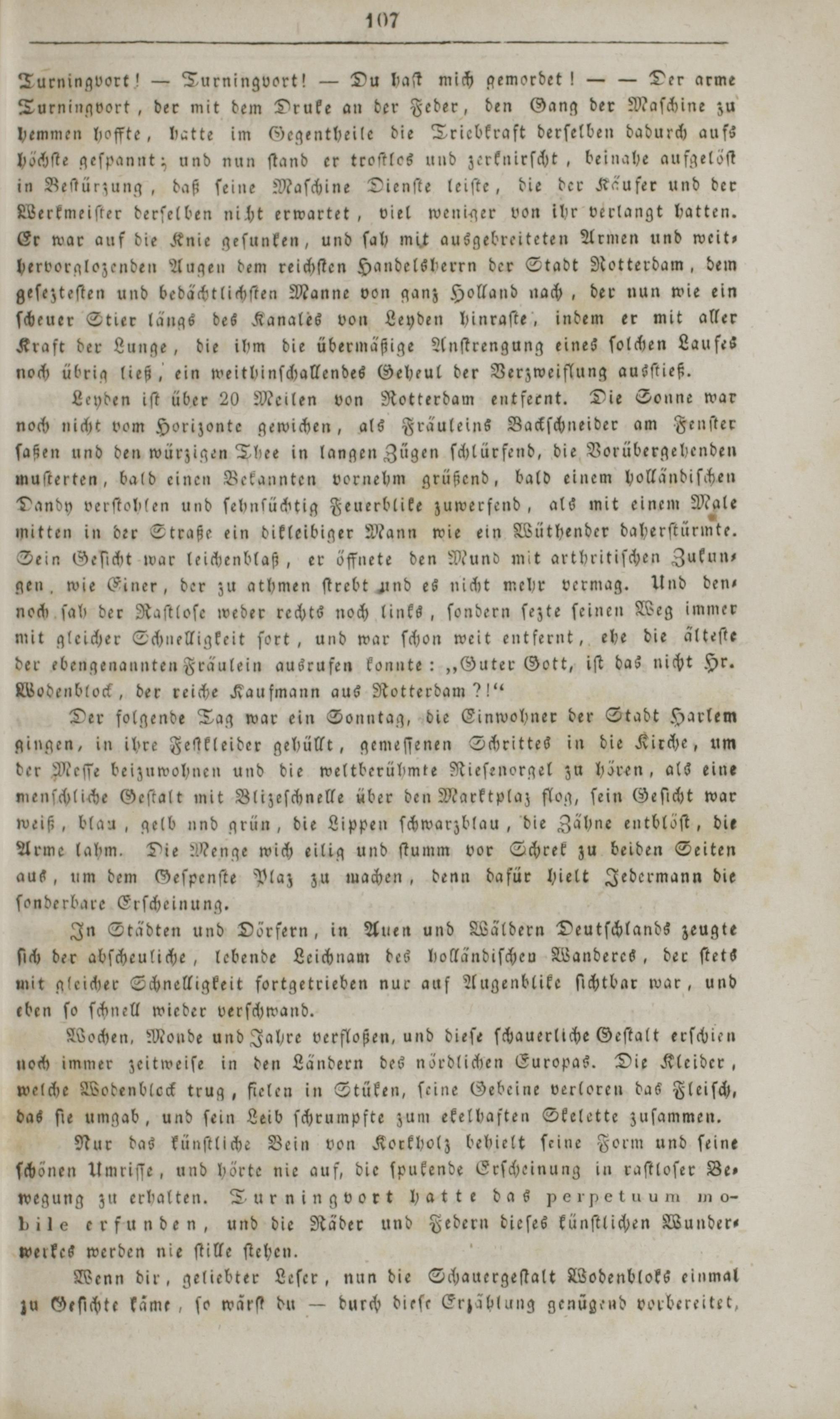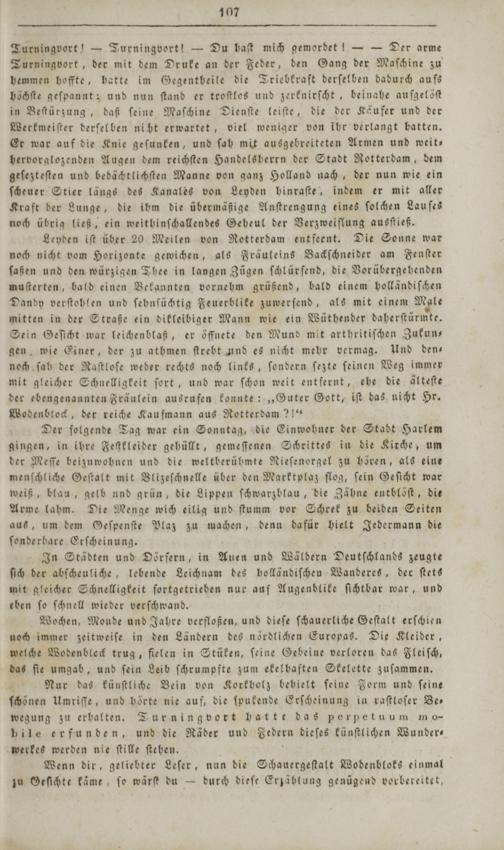 Turningvort!— Turningvort!— Du haſt mich gemordet!—— Der arme Turningvort, der mit dem Druke an der Feder, den Gang der Maſchine zu hemmen hoffte, hatte im Gegentheile die Triebkraft derſelben dadurch aufs höchſte geſpannt; und nun ſtand er troſtlos und zerknirſcht, beinahe aufgelöſt in Beſtürzung, daß ſeine Maſchine Dienſte leiſte, die der Käufer und der Werkmeiſter derſelben nicht erwartet, viel weniger von ihr verlangt hatten. Er war auf die Knie geſunken, und ſah mit ausgebreiteten Armen und weit— bervorglozenden Augen dem reichſten Handelsherrn der Stadt Rotterdam, dem geſezteſten und bedächtlichſten Manne von ganz Holland nach, der nun wie ein ſcheuer Stier längs des Kanales von Leyden hinraſte, indem er mit aller Kraft der Lunge, die ihm die übermäßige Anſtrengung eines ſolchen Laufes noch übrig ließ, ein weithinſchallendes Geheul der Verzweiflung ausſtieß.