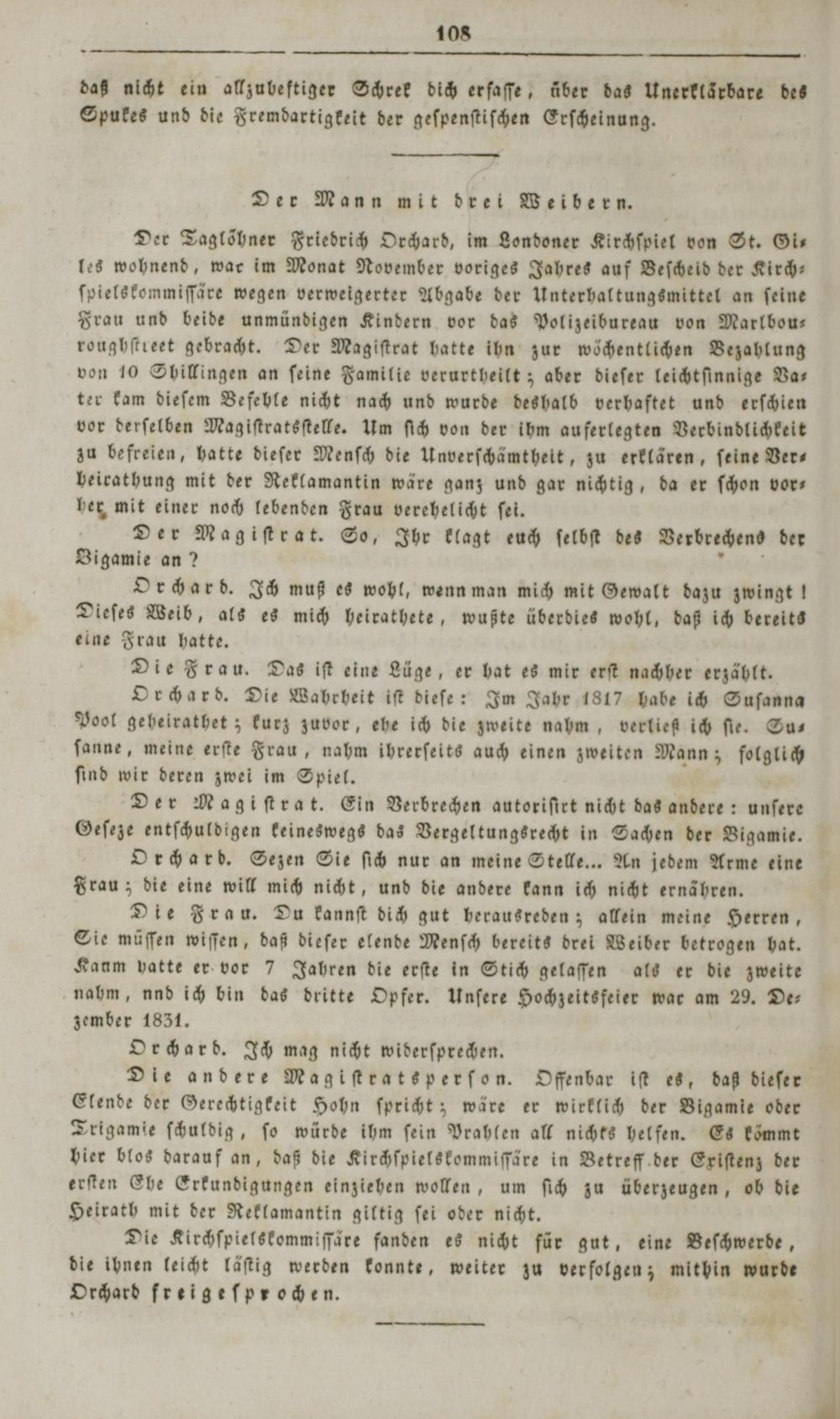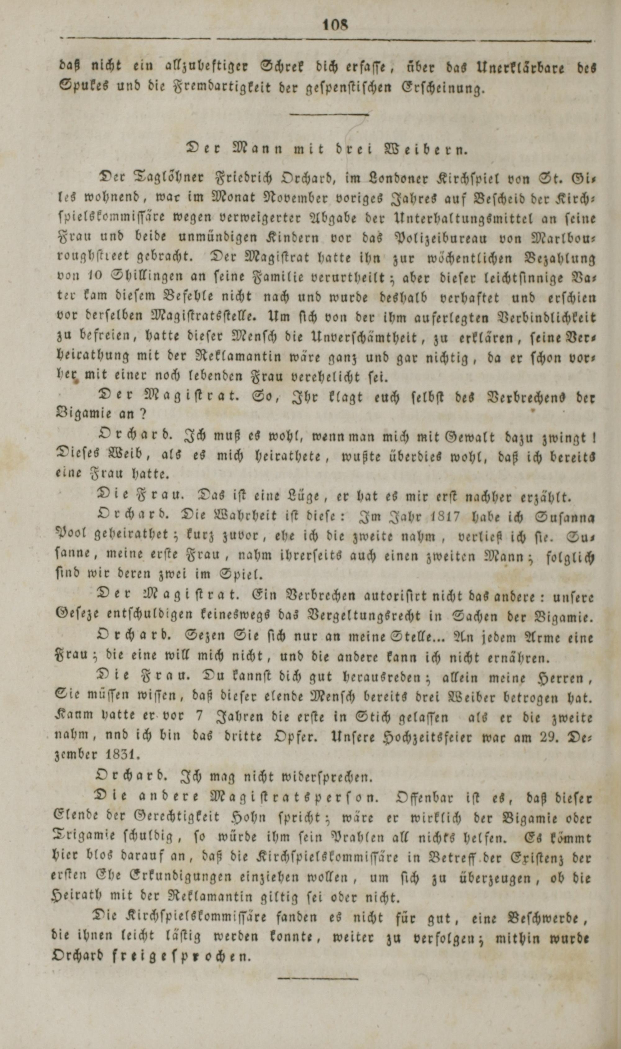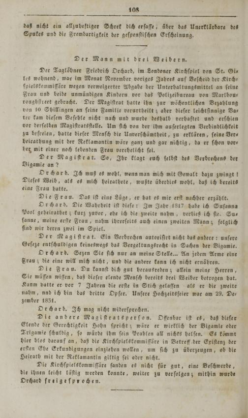 Der Taglöhner Friedrich Orchard, im Londoner Kirchſpiet von St. Gi— les wohnend, war im Monat November voriges Jahres auf Beſcheid der Kirch— ſpielskommiſſäre wegen verweigerter Abgabe der Unterhaltungsmittel an ſeine Frau und beide unmündigen Kindern vor das Polizeibureau von Marlbou— roughſtreet gebracht. Der Magiſtrat hatte ihn zur wöchentlichen Bezahlung von 10 Shillingen an ſeine Familie verurtheilt; aber dieſer leichtſinnige Va— ter kam dieſem Befehle nicht nach und wurde deshalb verhaftet und erſchien vor derſelben Magiſtratsſtelle. Um ſich von der ihm auferlegten Verbindlichkeit zu befreien, hatte dieſer Menſch die Unverſchämthelt, zu erklären, ſeine Ver beirathung mit der Reklamantin wäre ganz und gar nichtig, da er ſchon vor— her mit einer noch lebenden Frau verehelicht ſei.