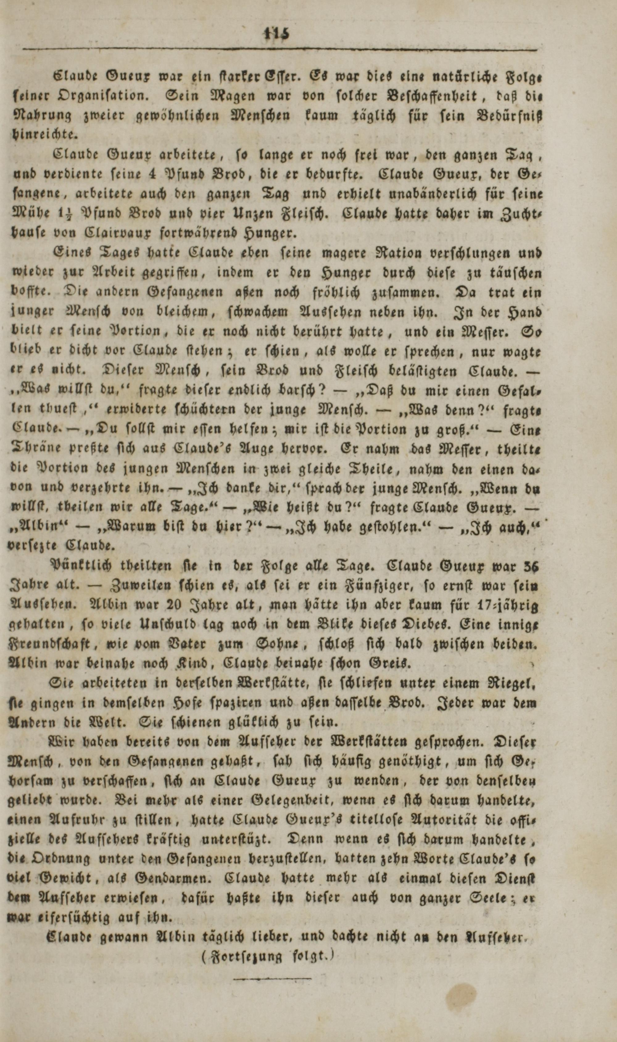 Claude Gueux arbeitete, ſo lange er noch frei war, den ganzen Tag, und verdiente ſeine 4 Pfund Brod, die er bedurfte. Claude Gueux, der Ge— ſangene, arbeitete auch den ganzen Tag und erhielt unabänderlich für ſeine Mühe 1 Pfund Brod und vier Unzen Fleiſch. Claude hatte daher im Zucht⸗ bauſe von Clairvaux fortwährend Hunger.